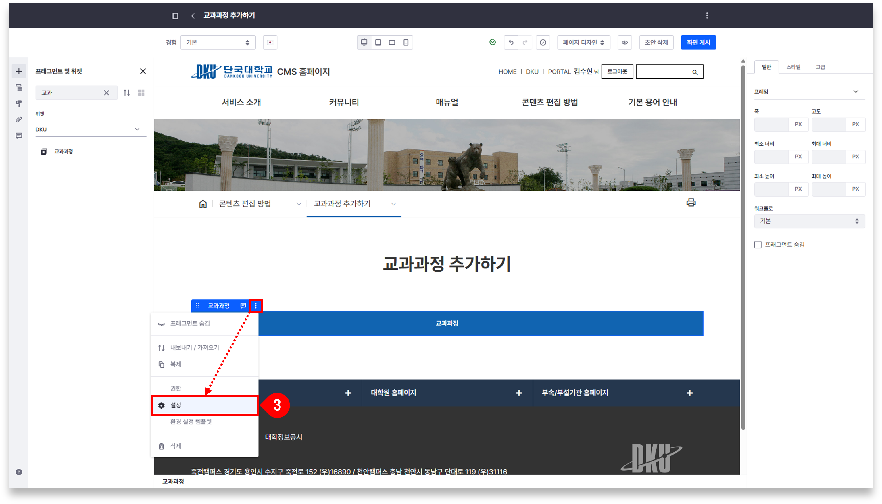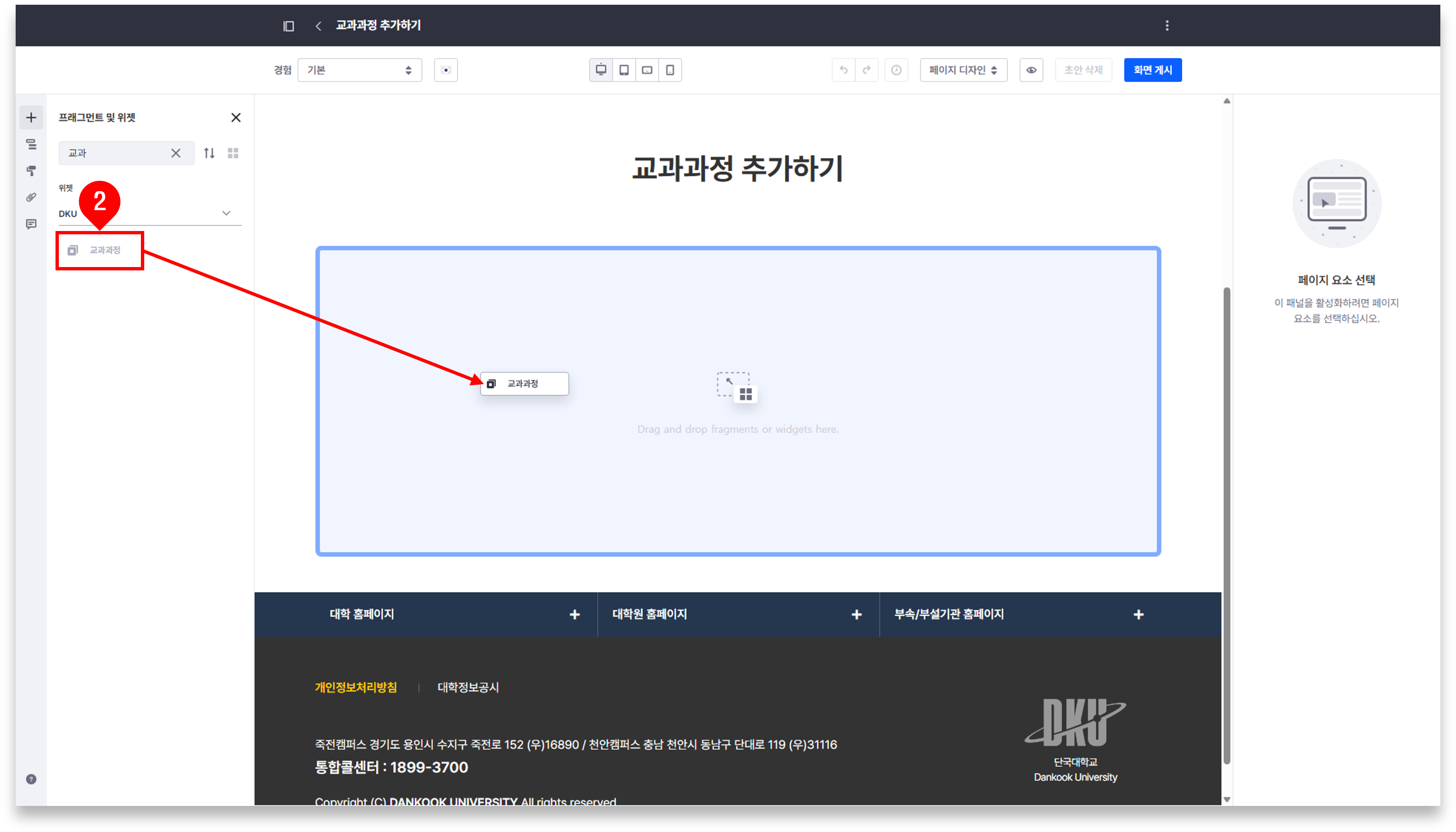 2. '교과과정' 위젯을 원하는 위치에 드래그하여 페이지에 추가합니다.