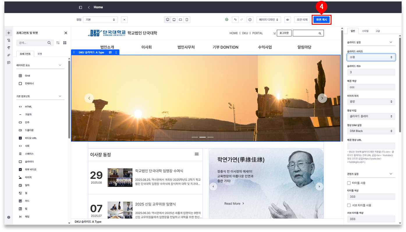 ④ 우측 상단의 [화면 게시]를 클릭하여 적용