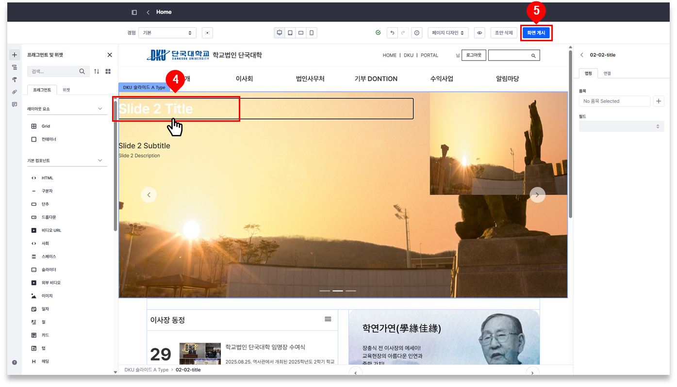 ③ 텍스트를 더블 클릭하여 내용을 수정한 후 [화면 게시]를 클릭하여 적용