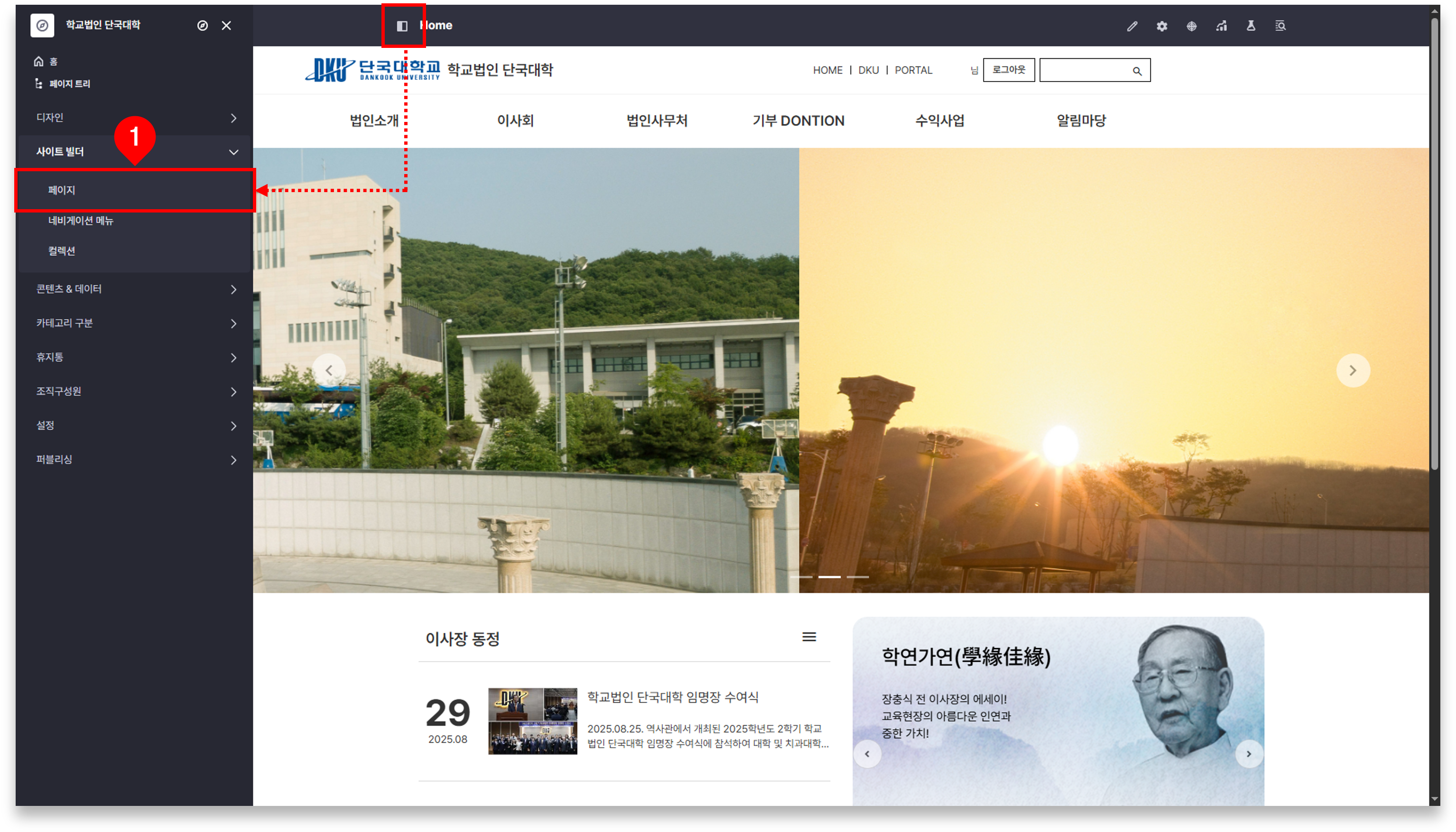 ① 좌측 상단의 ‘Open Product Menu’ 버튼 클릭 ⇒ [사이트 빌더]-[페이지] 메뉴 클릭