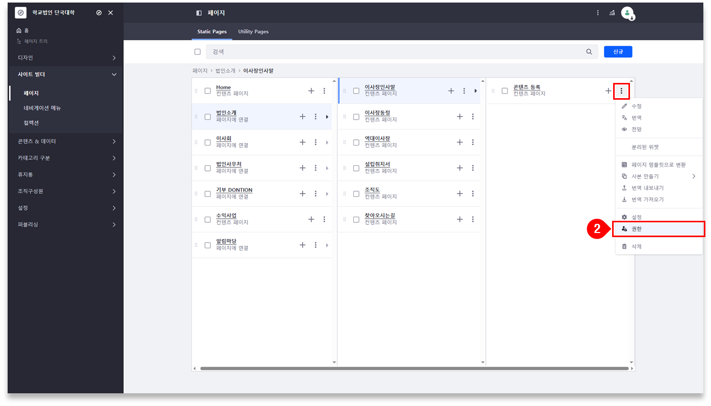 ② 권한을 등록할 페이지의 ( ⁝ ) 버튼 클릭 ⇒ [권한] 메뉴 클릭