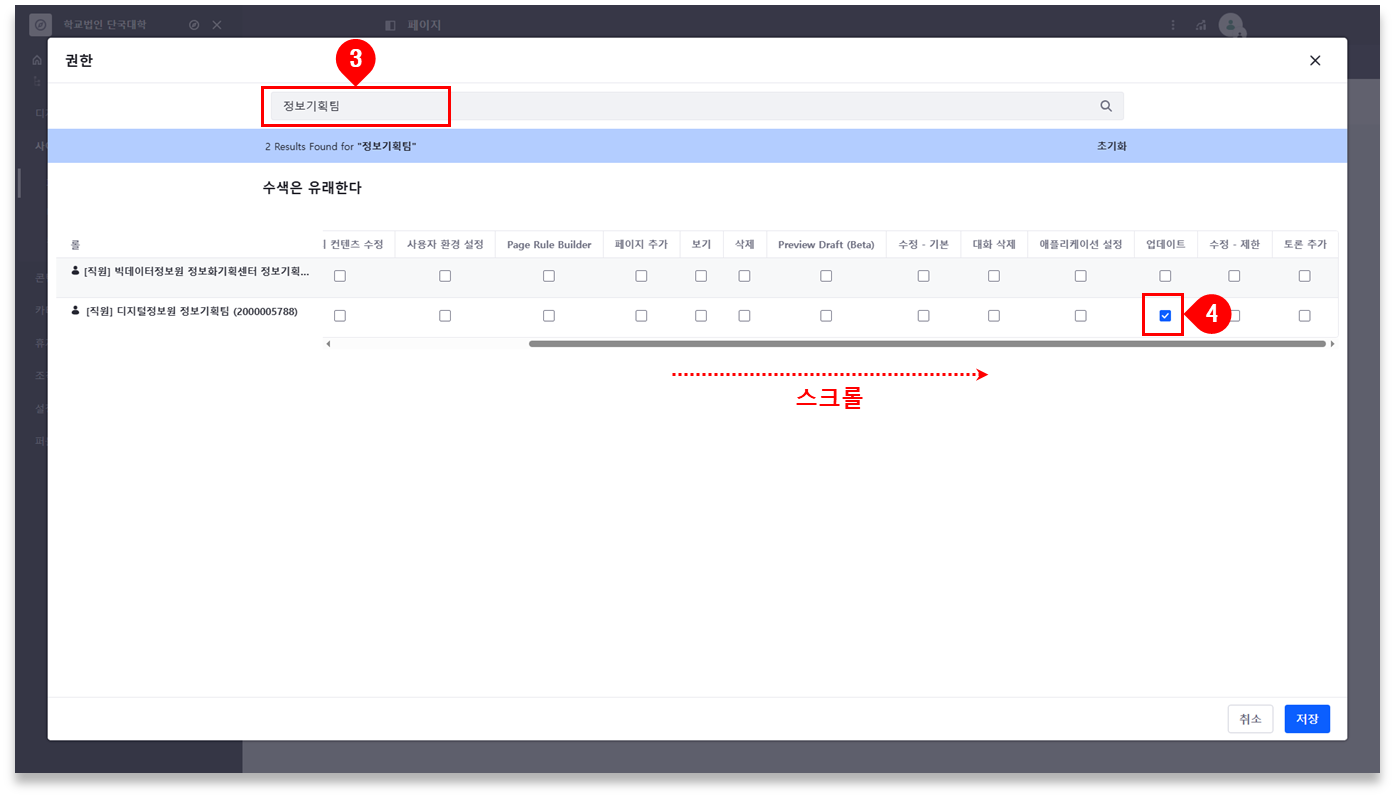 부서명 또는 조직코드 검색 ⇒ 권한 유형에서 ‘업데이트’ 선택 ⇒ [저장] 클릭