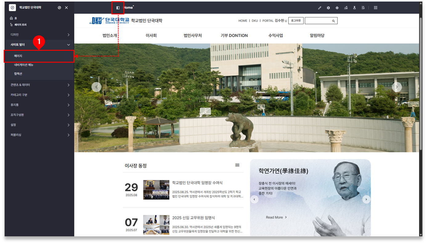 ① 좌측 상단의 ‘Open Product Menu’ 버튼 클릭 ⇒ [사이트 빌더]-[페이지] 메뉴 클릭