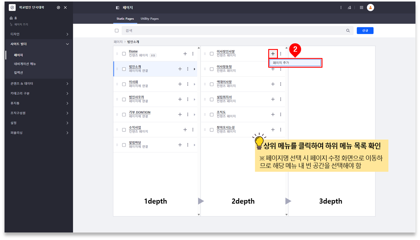 ② 하위 페이지를 생성하려는 메뉴 선택 ⇒ ‘하위페이지 등록‘( + ) 버튼 클릭 ⇒ [페이지 추가] 메뉴 클릭