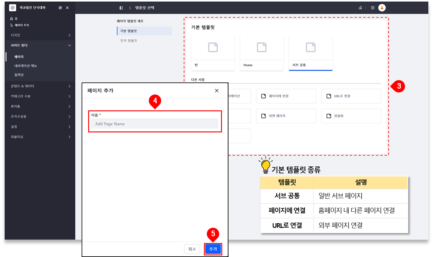 ③ 템플릿 선택 ⇒ 페이지명 입력 ⇒ [추가] 클릭