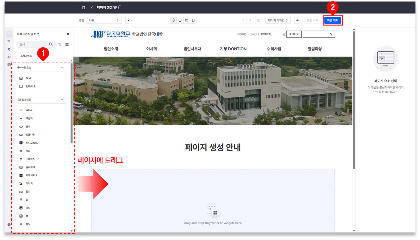 ① 왼쪽의 '프래그먼트 및 위젯'에서 원하는 요소를 페이지에 드래그하여 추가/편집