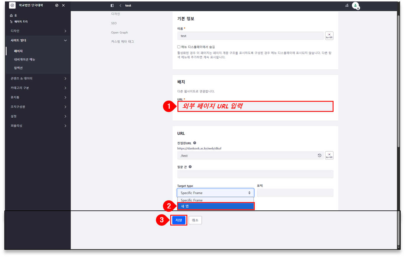 ※ 사용자 편의를 위해 외부 페이지는 ‘새 탭’으로 열리도록 설정하는 것이 좋음