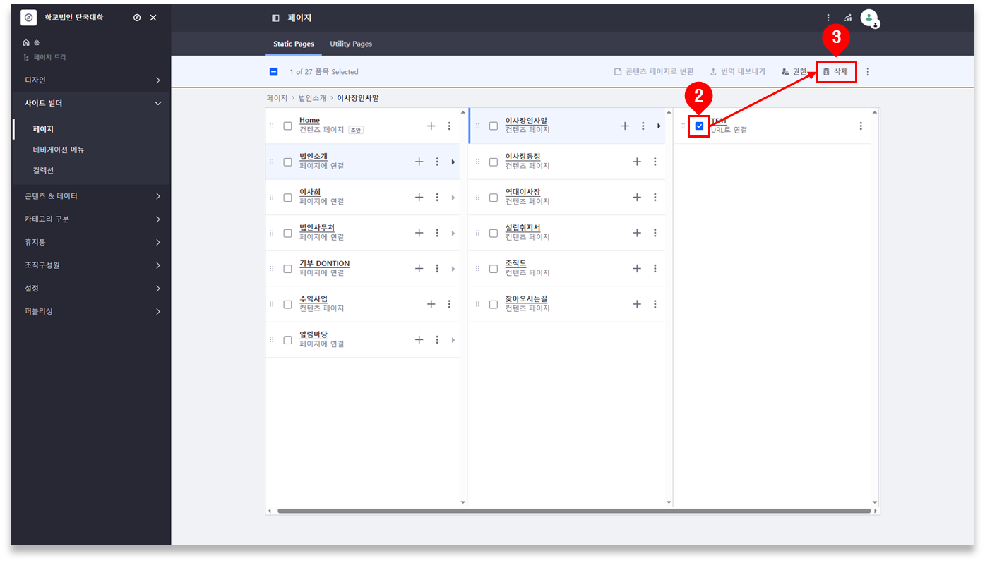 ② 삭제할 페이지의 체크박스 선택 ⇒ [삭제] 클릭