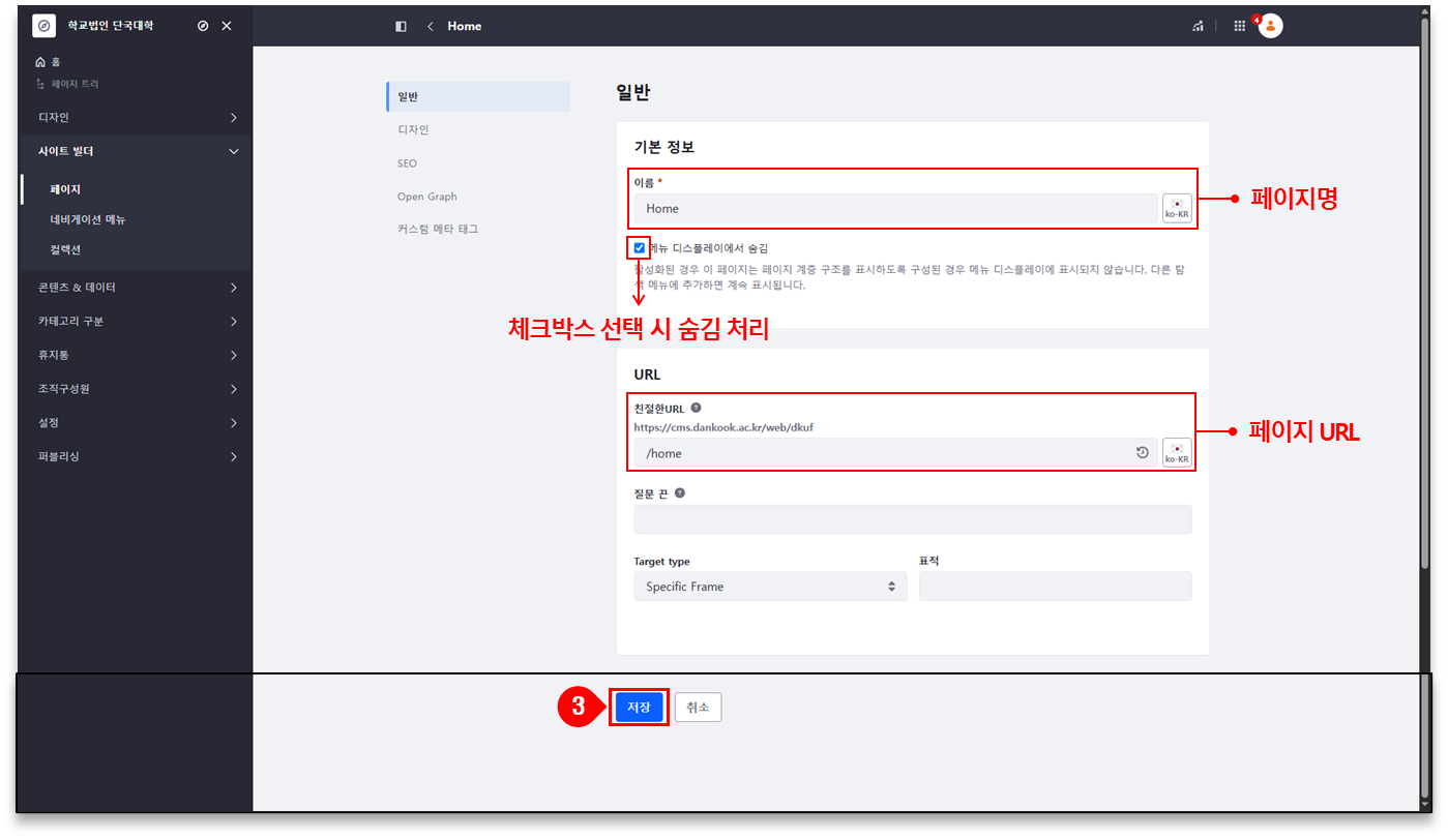 ③ 페이지 정보 수정 후 페이지 하단의 [저장]을 클릭하여 적용