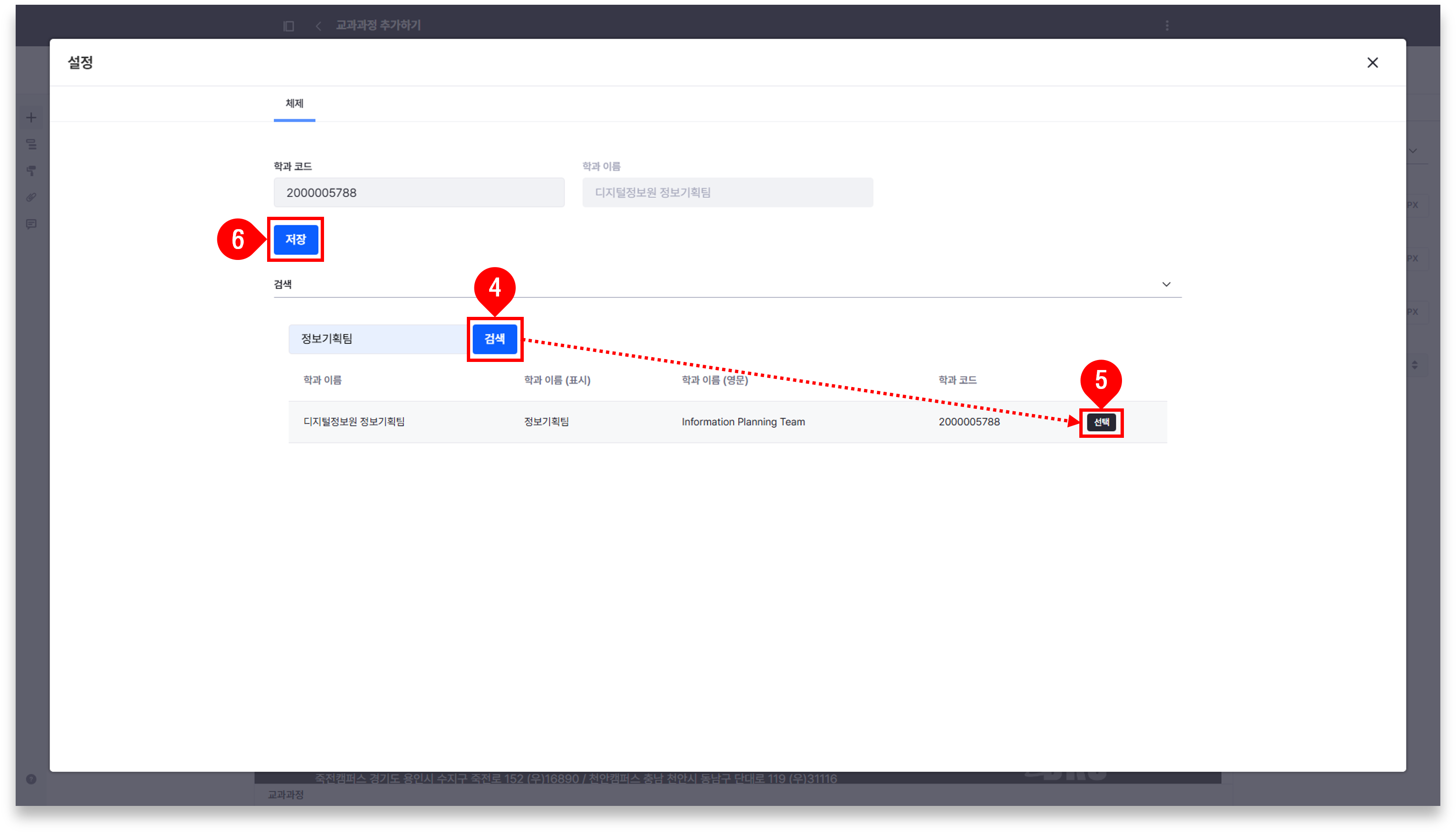4. 교과과정을 추가할 조직명 또는 조직 코드를 입력한 후 검색을 클릭합니다.