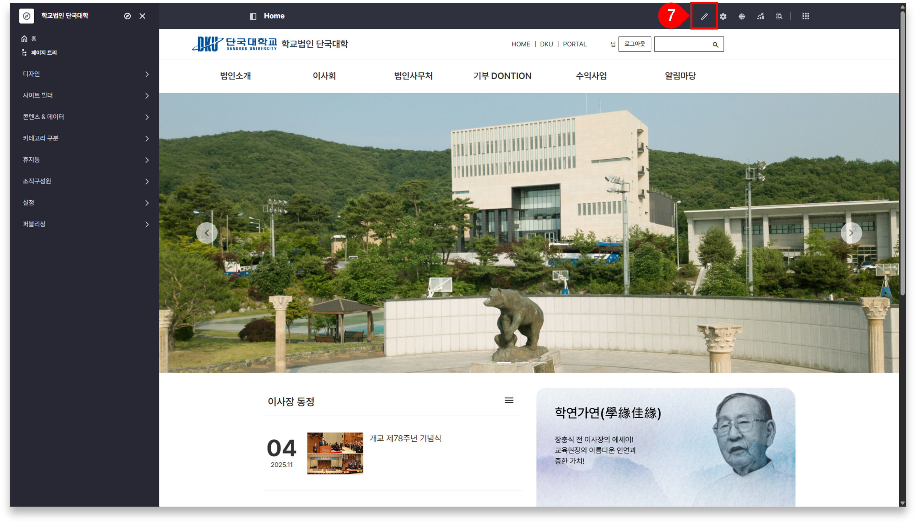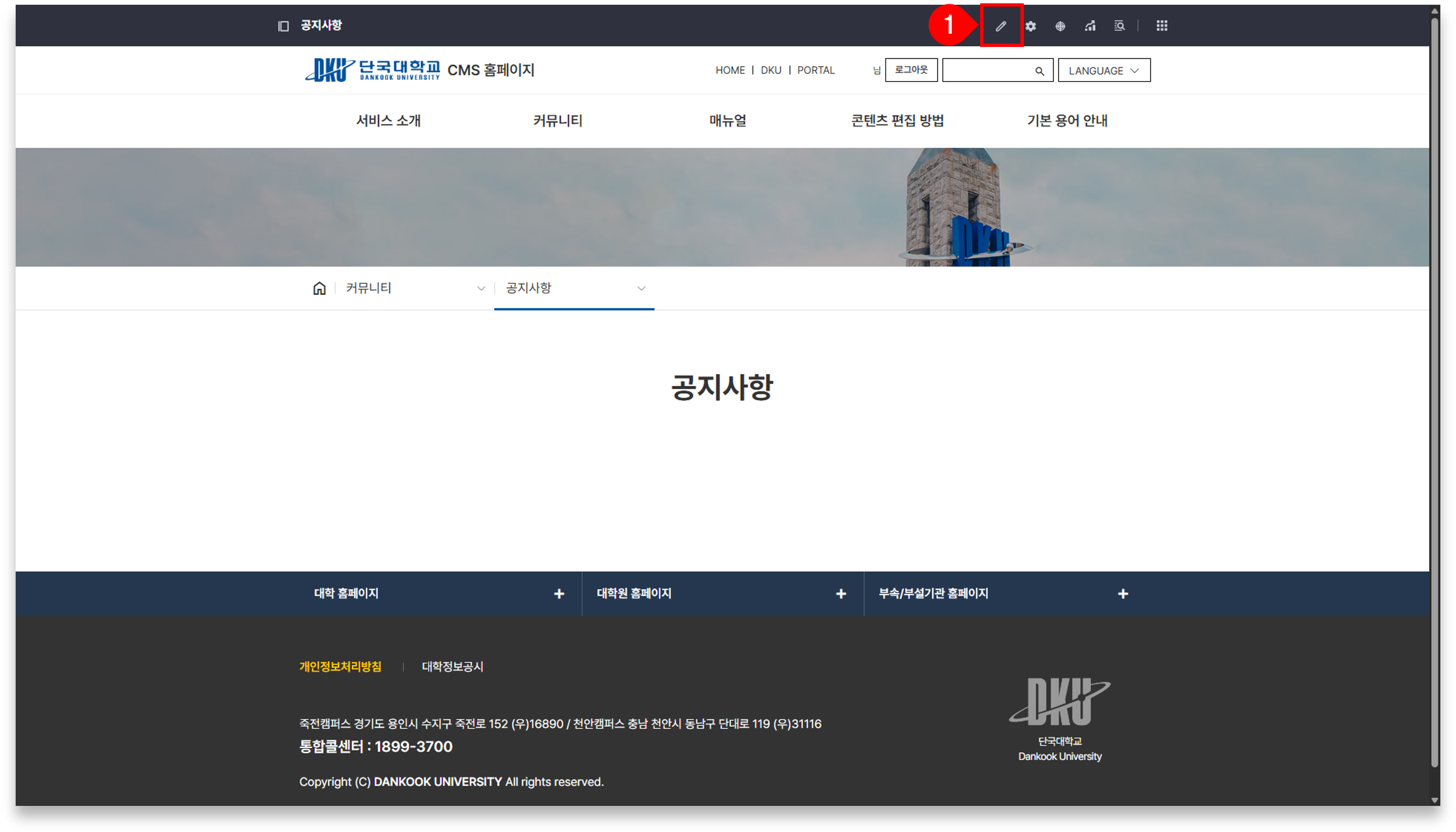 ⑩ 정보기획팀 홈페이지 담당자에게 문의하여 템플릿 변경 요청(031-8005-2309 / cms@dankook.ac.kr)
