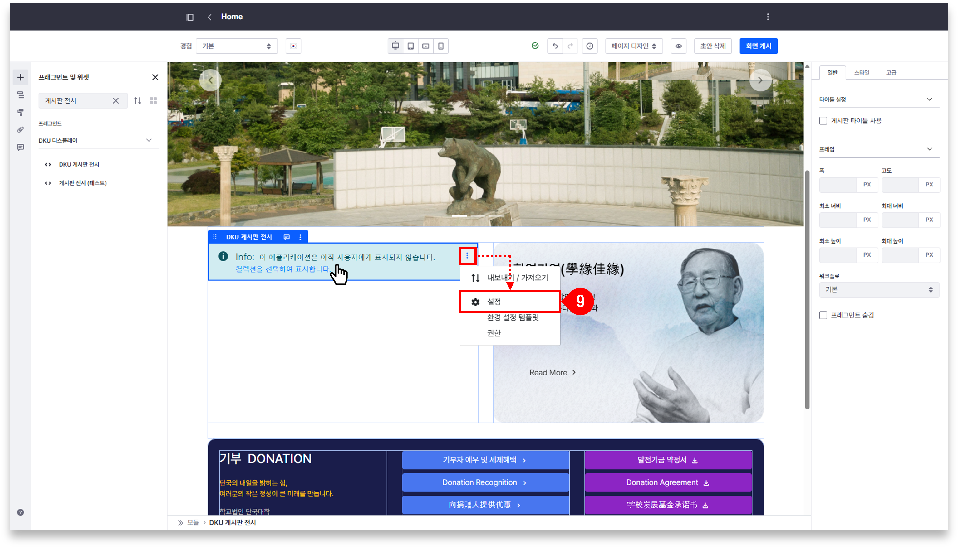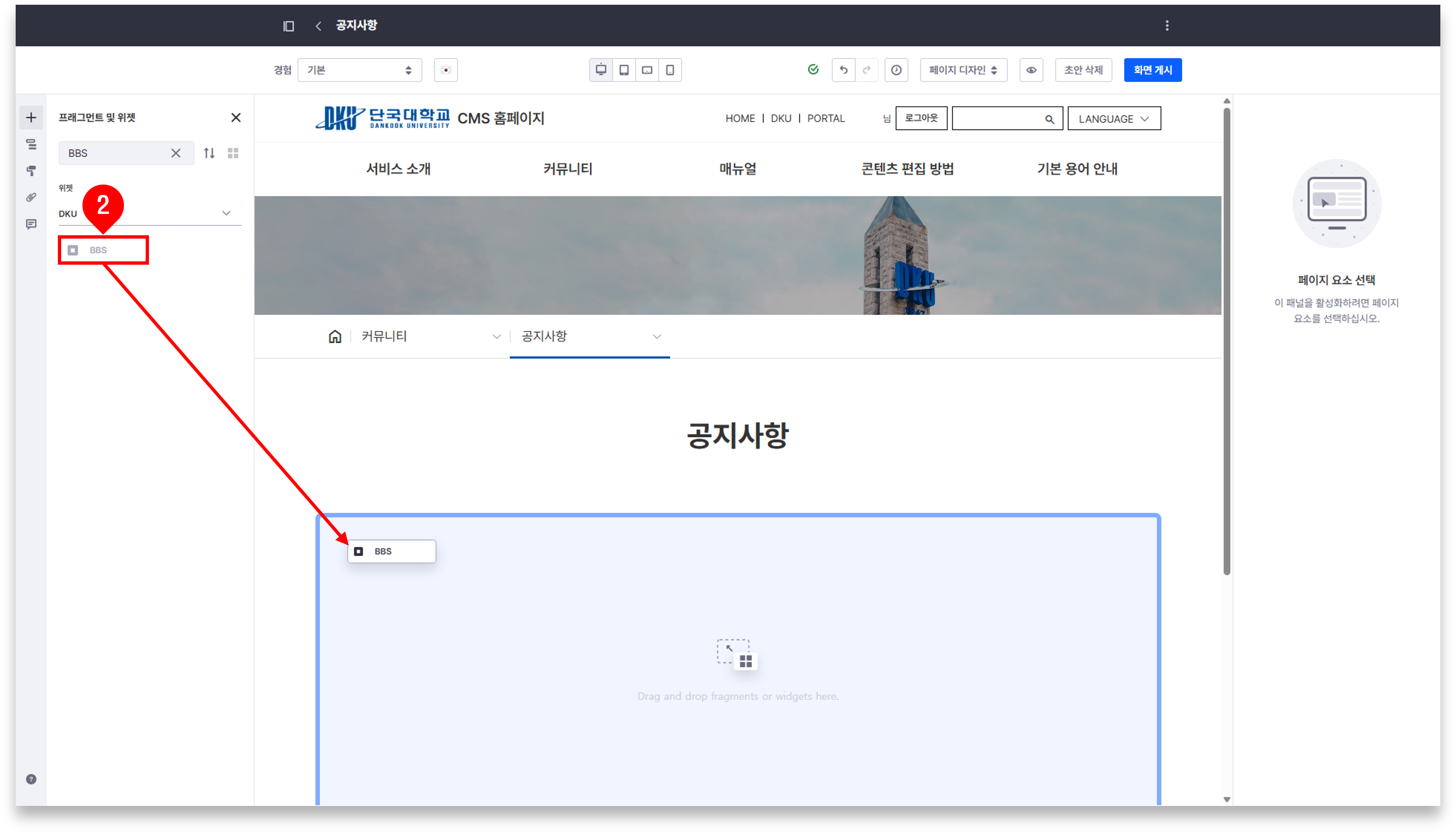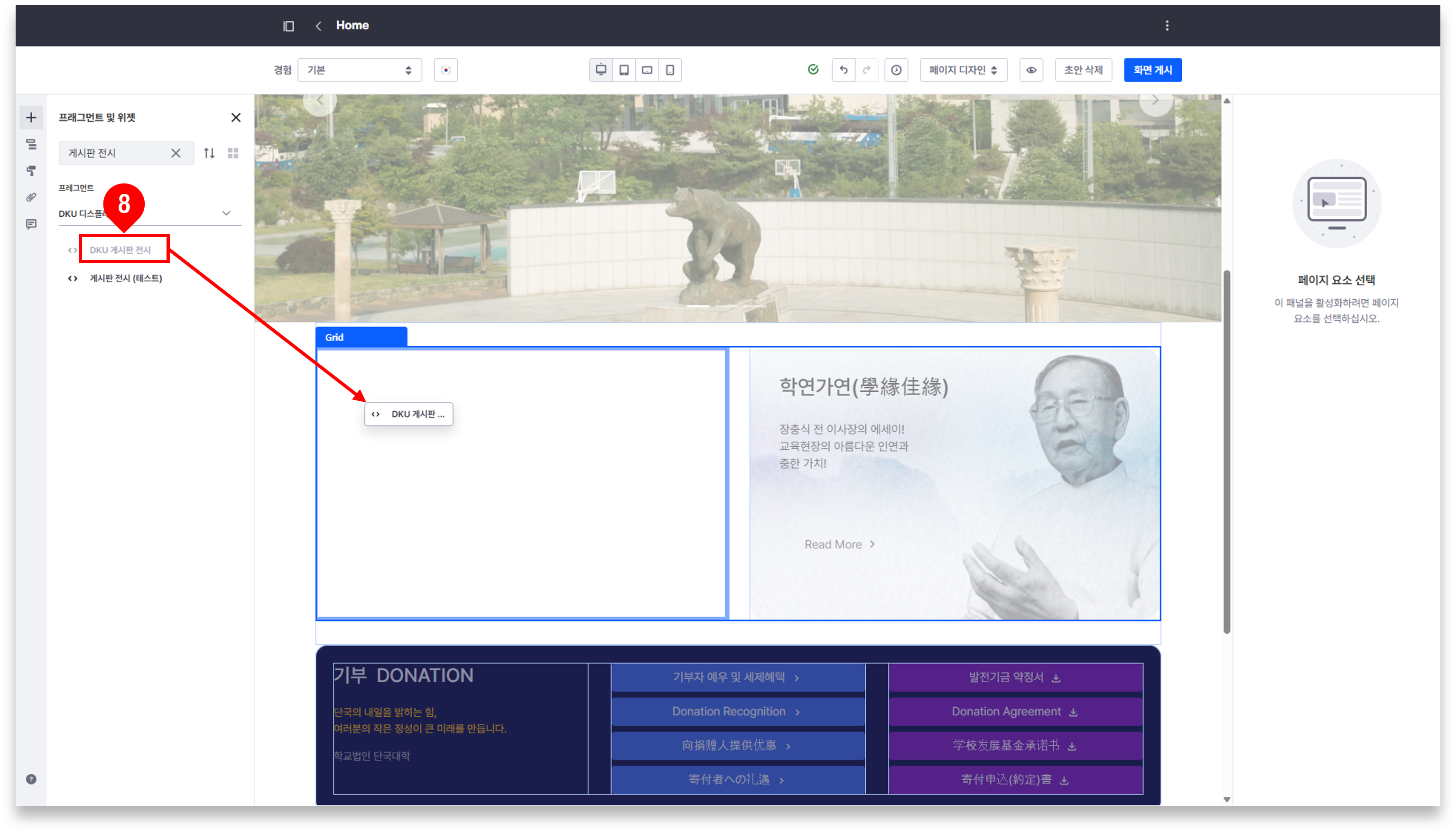 ‘DKU 게시판 전시’ 프래그먼트를 원하는 위치에 드래그하여 페이지에 추가