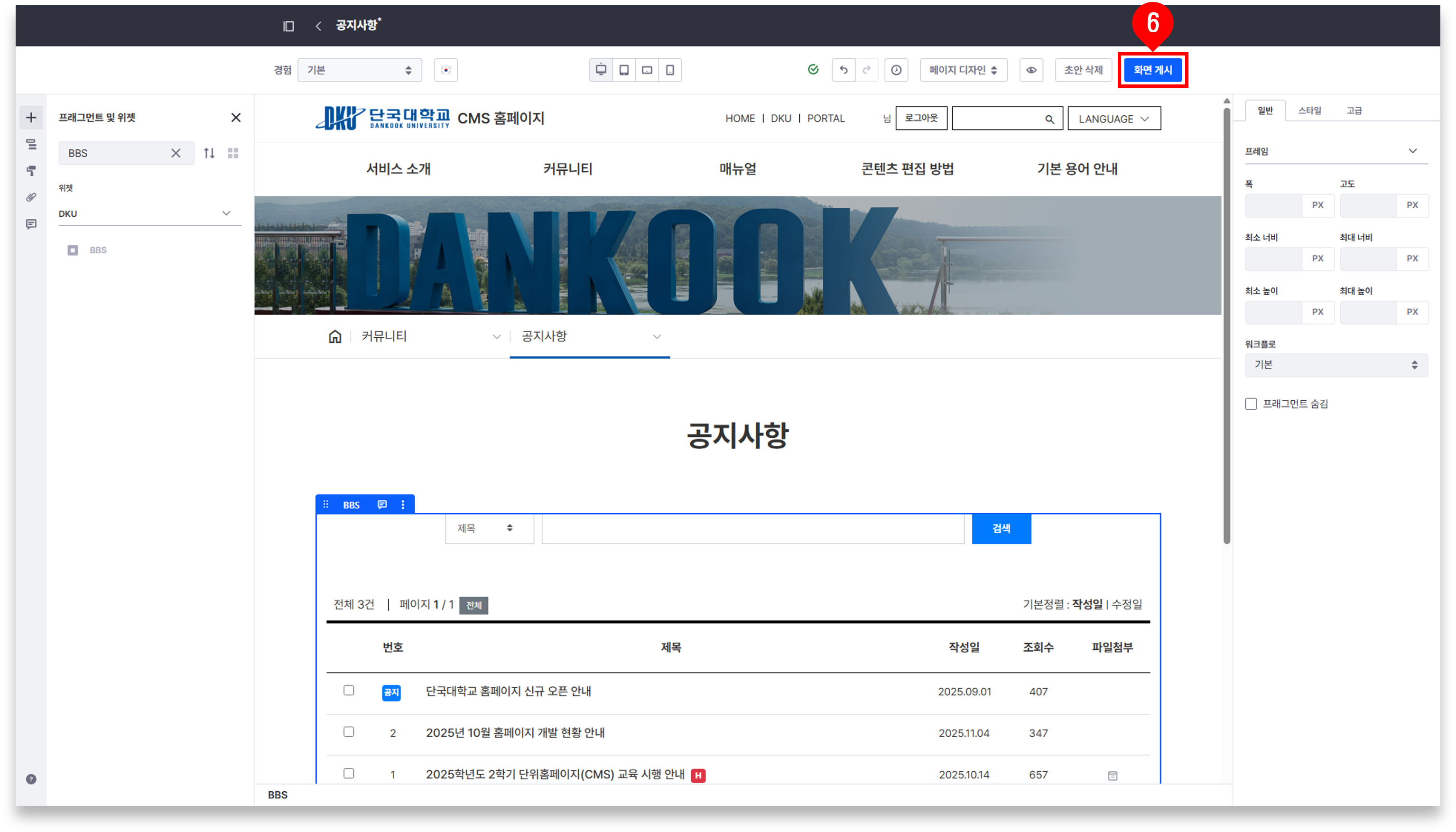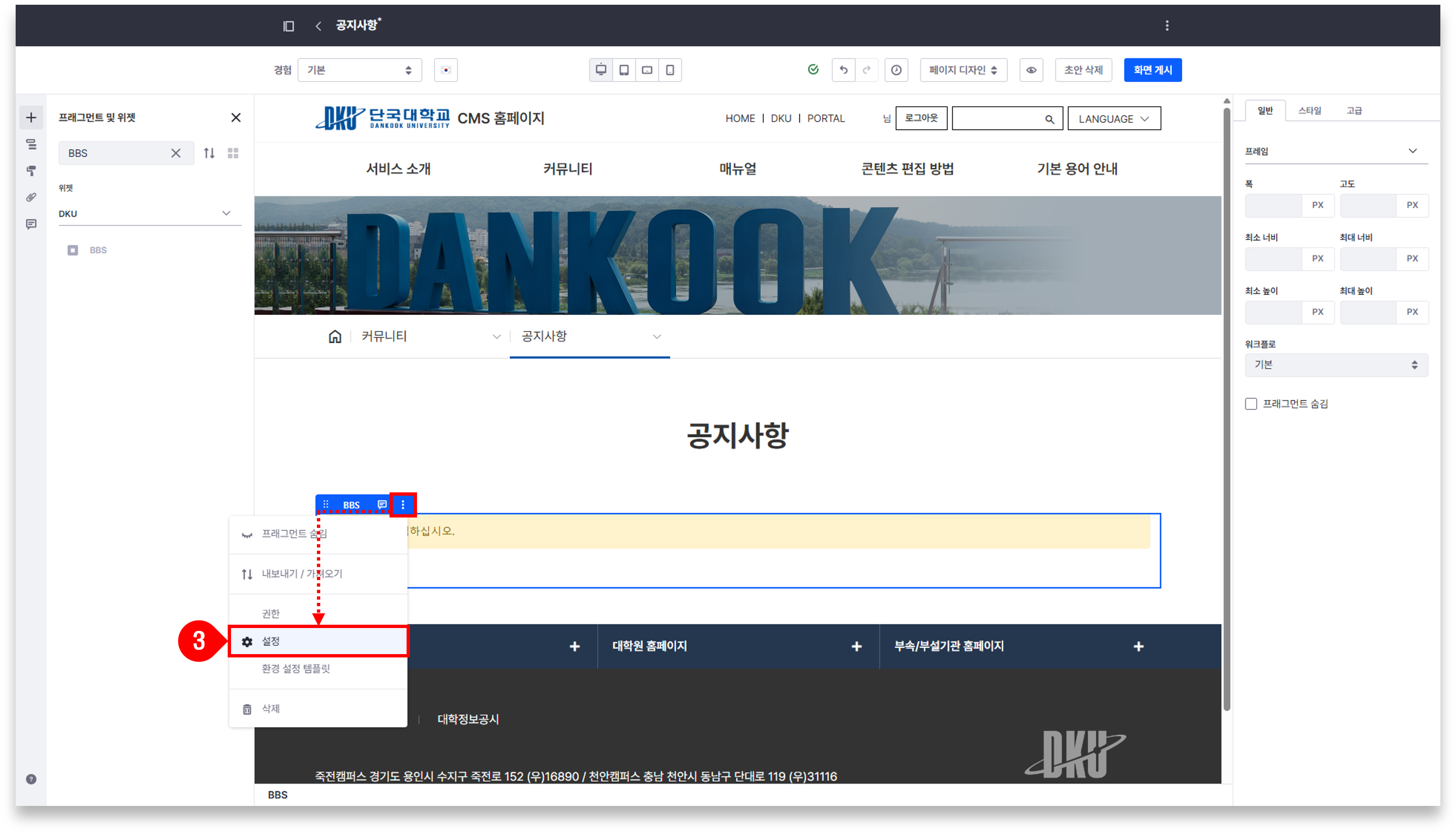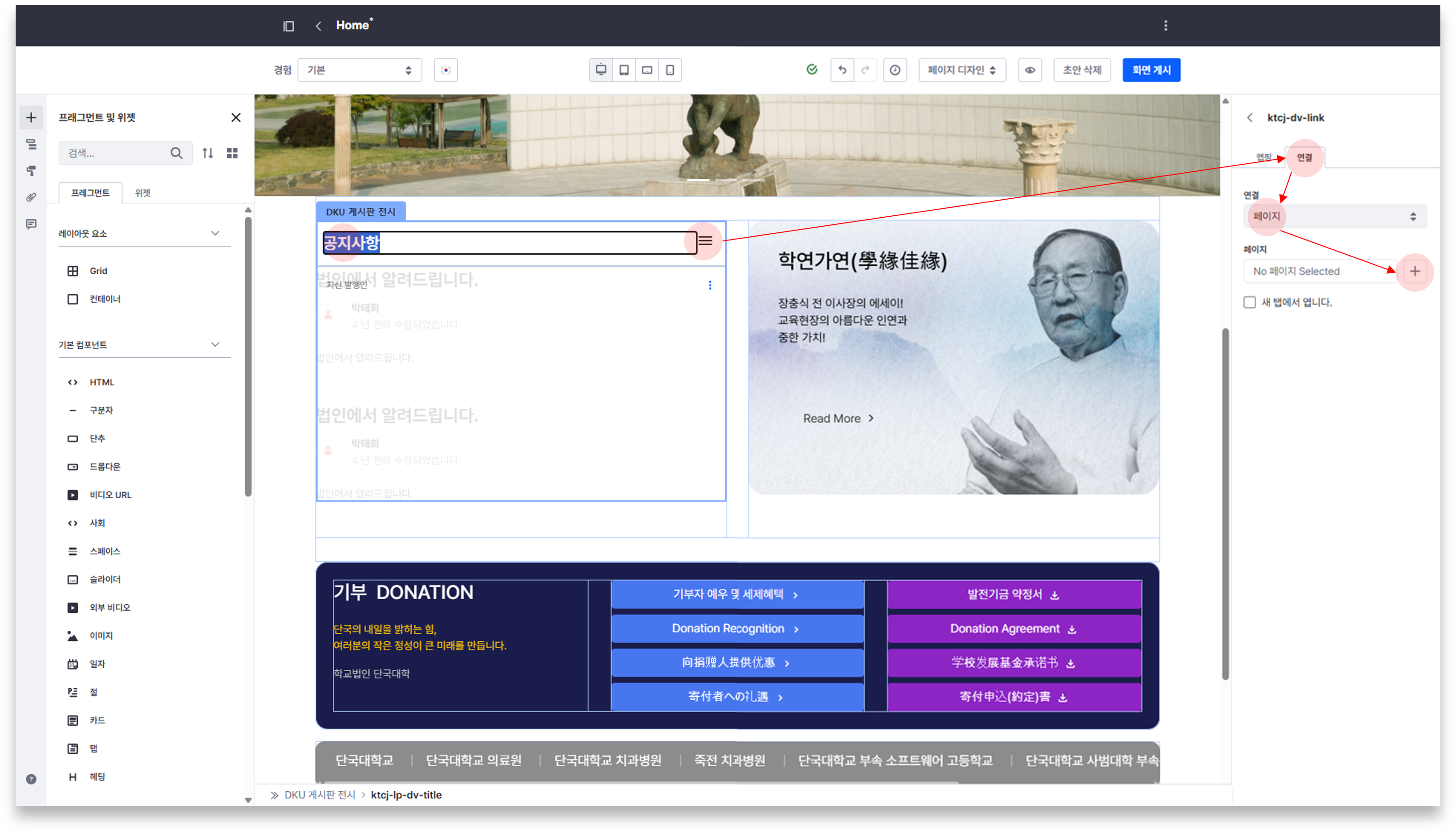 ‘DKU 게시판 전시’ 프래그먼트를 원하는 위치에 드래그하여 페이지에 추가