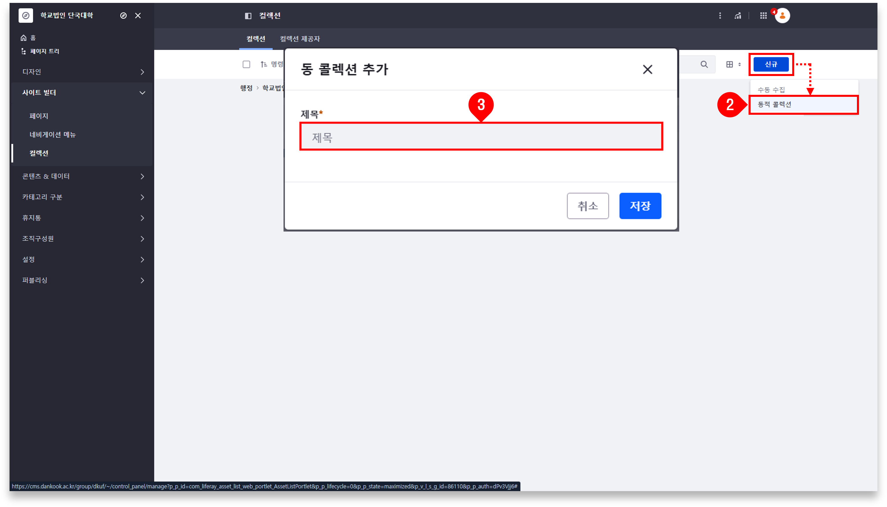 ② 우측 상단의 [신규]-[동적 콜렉션] 메뉴 클릭 ⇒ 콜렉션 이름 입력 (게시판 이름과 동일하게 입력)