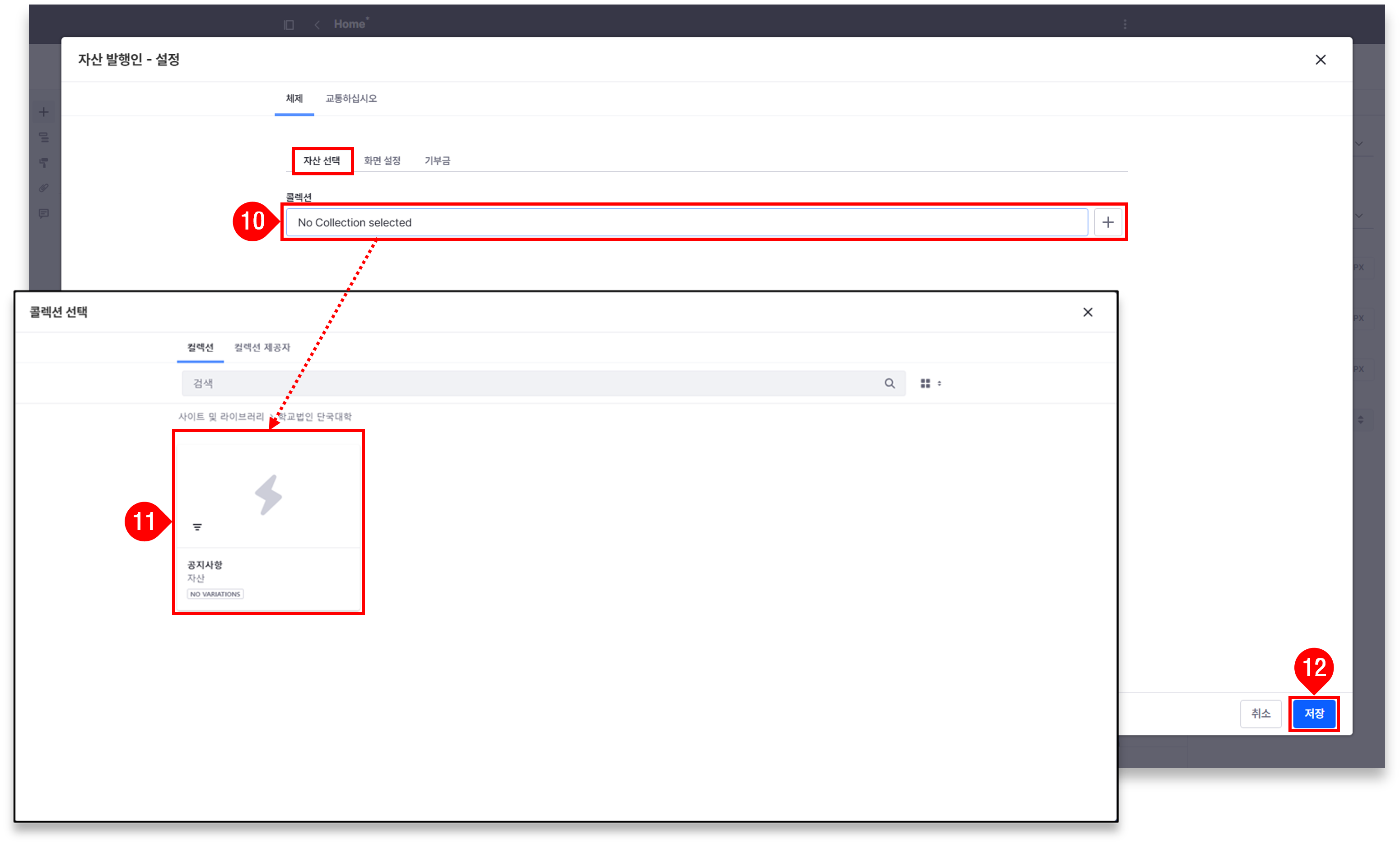 ‘자산 선택’ 탭으로 이동한 후 콜렉션 클릭 ⇒ 적용할 콜렉션(게시판) 선택 ⇒ [저장] 클릭