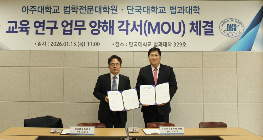 우리 대학 법과대학(학장 오승진)이 지난 15일(목) 죽전캠퍼스 법학관에서 아주대학교 법학전문대학원(원장 소병천)과 교육 및 연구 협력을 위한 양해각서(MOU)를 체결했다. △오승진 법과대학장(왼쪽)이 소병천 아주대 법학전문대학원장과 업무협약 체결 후 기념 촬영을 하고 있다.  양 기관은 이번 협약을 통해 ▲학부·대학원 간 교육 협력 ▲학술 세미나 및 워크숍 공동 개최 ▲산학협력 관련 공동 연구 참여 ▲지역 사회 봉사 등 다양한 분야에서 상호 협력하기로 합의했다.  특히 양 기관은 이번 협약의 핵심 과제로 ‘해외 AI 법률서비스 지원사업’을 공동추진한다. 이를 위해 양 대학 소속 교수진으로 구성된 공동 연구진 및 자문단을 발족할 계획이다. 자문단은 AI 기술을 활용한 법률서비스 수요가 급증하는 해외 지역을 대상으로 AI 기반 법률서비스의 적법성, 윤리성, 책임 구조 등에 대한 법률 검토와 자문을 수행하게 된다.  또한, 양 기관은 이 사업을 통해 교육과 연구의 연계도 강화한다. 사업 수행 과정에서 도출된 주요 쟁점을 바탕으로 공동 학술연구를 진행하고, 이를 특강 및 세미나 형태의 교육 프로그램으로 연계하여 교육과 연구의 선순환 구조를 구축한다는 방침이다. 오승진 법과대학장은 “이번 협약은 급변하는 법·기술 환경에 능동적으로 대응하는 교육·연구 협력 모델을 구축하는 계기가 될 것”이라며 “앞으로 국내외 법률 서비스 향상과 학문 발전에 기여할 수 있도록 노력하겠다”고 밝혔다.  한편, 법과대학은 법학세미나실, 법학전문도서관, 로스쿨 진학반 및 고시반(법선재) 운영 등 체계적인 교육 인프라를 갖추고 있다. 또한 무료 법률상담센터를 운영하며 지역 사회 공헌에도 앞장서고 있다.