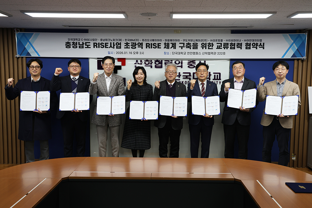 단국C-RISE사업단(단장 백동헌)이 충남 지역의 RISE사업 혁신 체계를 구축하고 미래 산업을 이끌 핵심 인재를 양성하기 위해 다자간 업무 협약을 체결했다.   ▲백동헌 단장(왼쪽 다섯 번째)과 협약 기관 관계자들이 기념촬영을 하고 있다.   지난 16일(금) 오후 2시 천안캠퍼스 산학협력단에서 열린 협약식에는 백동헌 C-RISE사업단장, 김태형 교수(정보융합기술.창업대학원장, 천안 스마트도시 총괄계획가) 등 대학 관계자와 ▶ 장용호 충남테크노파크 디지털혁신단장, ▶ 김정호 글로벌 컴퓨터 기업 전무 ▶손병희 (주)마음에이아이 전무 ▶ 양종민 쿠도커뮤니케이션(주) 이사 ▶ 강병기 ㈜라온피플 부사장 ▶ 민광기 ㈜이씨마이너 대표이사 ▶ 안치성 ㈜어반데이터랩 대표 등 8개 협약 기관 관계자들이 참석했다.   이번 협약에 따라 단국C-RISE사업단과 참여 기관들은  △인재 양성을 위한 교육 프로그램 개발 및 공유 확대 △각종 프로젝트 기획 및 공동 활용을 위한 협력 확대 △최신 기술 및 산업 동향 정보 공유 △우수 인력의 지역 정주를 위한 프로그램 상호 교류 등 충남 RISE사업의 성공적인 운영을 위해 전방위적인 협력 체계를 가동하기로 했다.   특히 이날 행사에서는 (주)이씨마이너의 ‘소프트웨어 사용권 증서 전달식’ 도 함께 진행됐다. 국내 대표 데이터 마이닝 소프트웨어 기업인 (주)이씨마이너는 우리 대학 학생들의 빅데이터 분석 역량 강화와 실무 중심 교육을 지원하기 위해 자사 소프트웨어 사용권 1000카피(시가 5억 원 상당)를 기증하며 의미를 더했다.   백동헌 단장은 환영사를 통해 “단국C-RISE사업단이 중심이 된 이번 협약은 지역 산업의 경쟁력을 높이고 인재들이 지역 내에서 꿈을 펼칠 수 있는 든든한 기반이 될 것”이라며 “글로벌 기업을 비롯한 유수의 첨단 기업들과 함께 충남의 미래 변화를 이끄는 혁신적인 교육 모델을 만들어가겠다”고 밝혔다.