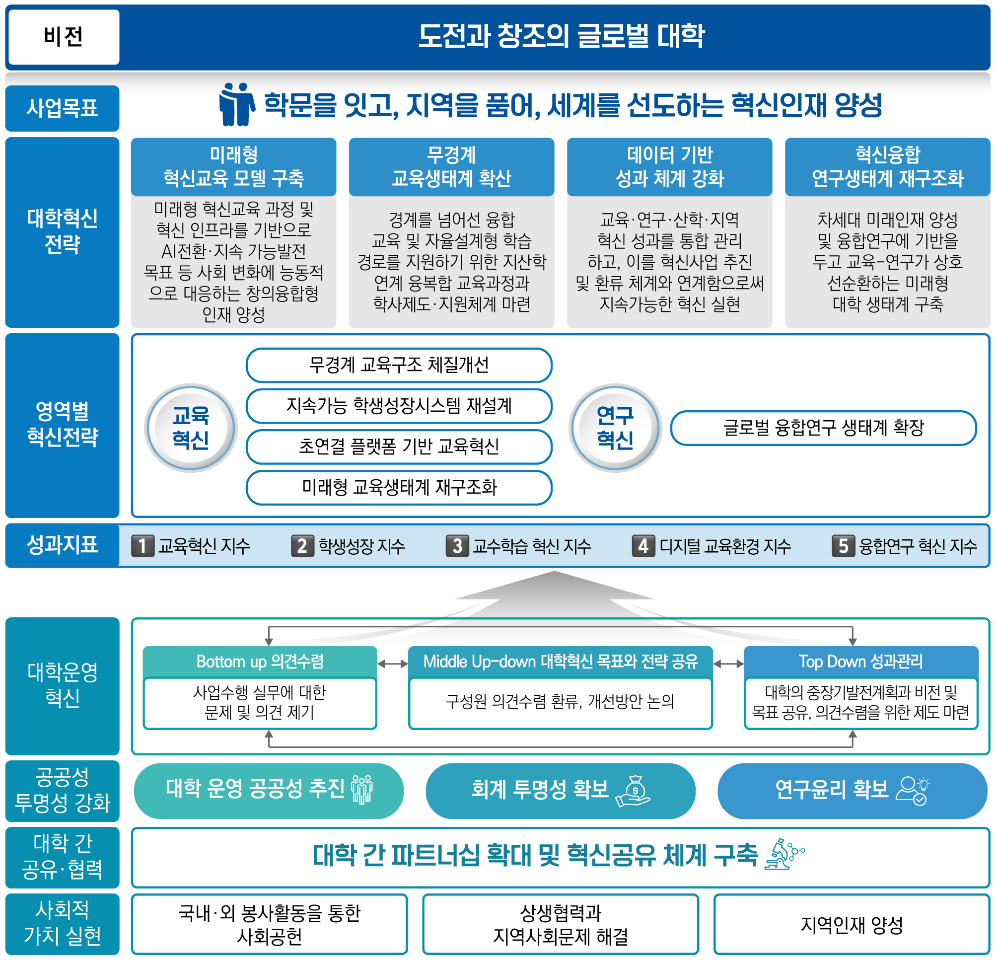 교육과 연구영역의 지속가능한 혁신을 추진하기 위해 대학운영 혁신, 공공성·투명성 강화, 대학 간 공유·협력, 사회적 가치 실현 방안을 함께 추진