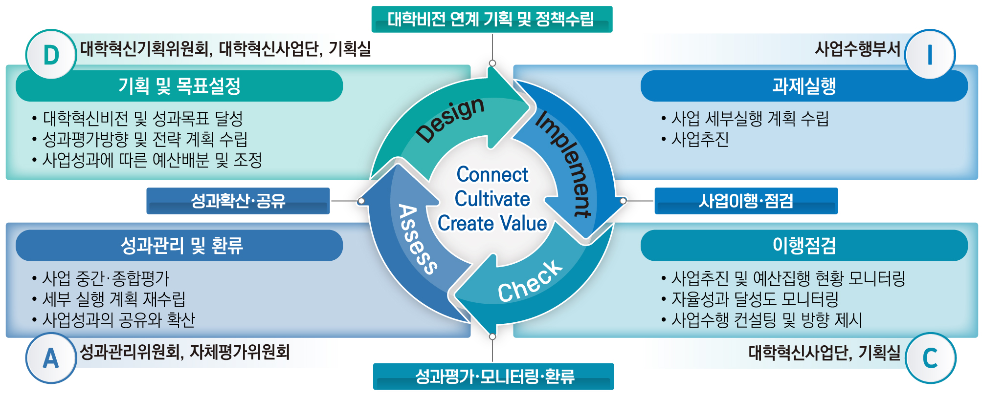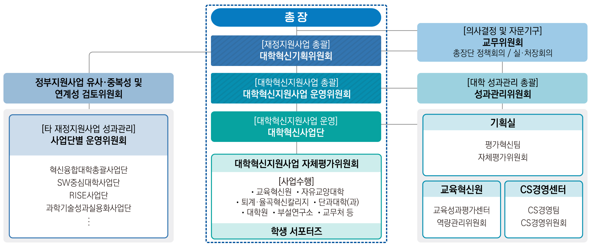 대학혁신지원사업을 성공적으로 수행하기 위해 총장을 필두로 관련 위원회, 사업관리 부서, 사업수행부서 및 관련 기관과 유기적인 협조 체제를 구축