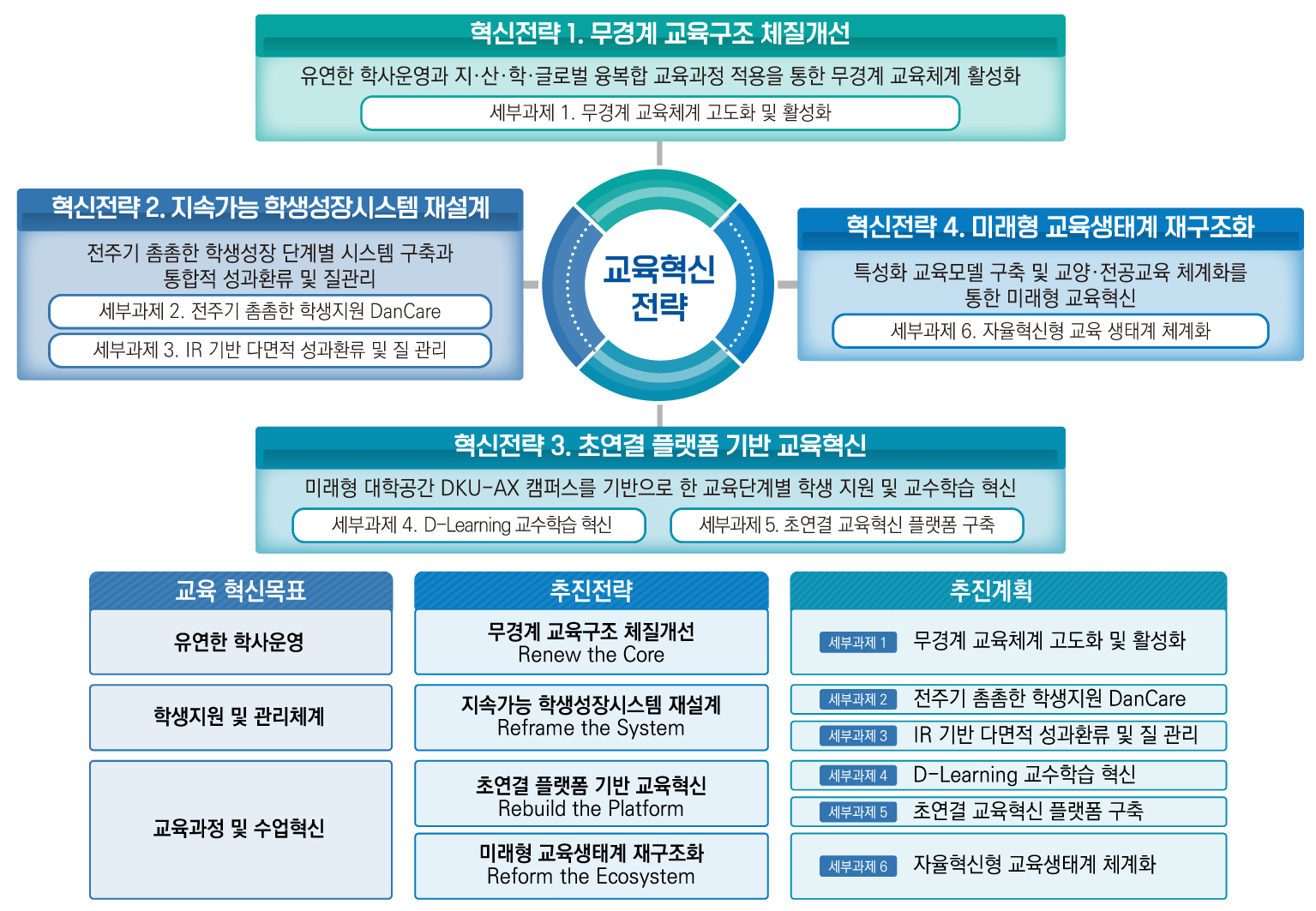 대학혁신지원사업 교육 혁신전략은 대학 중장기 발전계획을 실현하기 위해 4대 혁신전략을 설정하고, 6개 세부과제를 도출하여 사업 추진