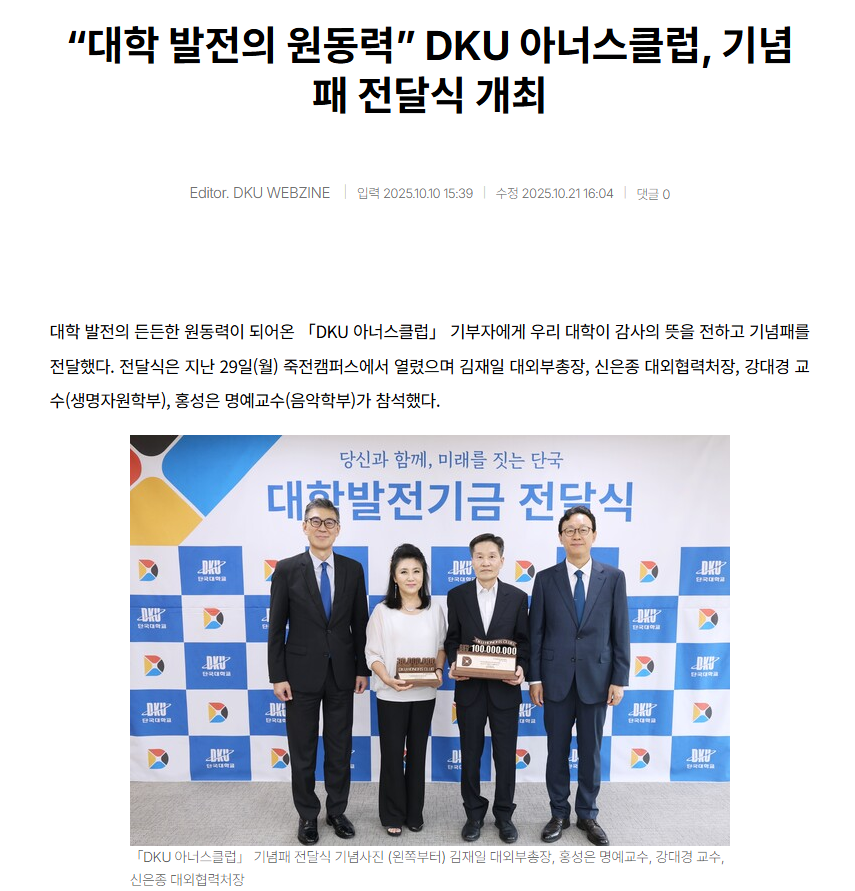 2021.10.11 - 단국대학교 김인호 교수, 발전기금기탁액 10억원 돌파