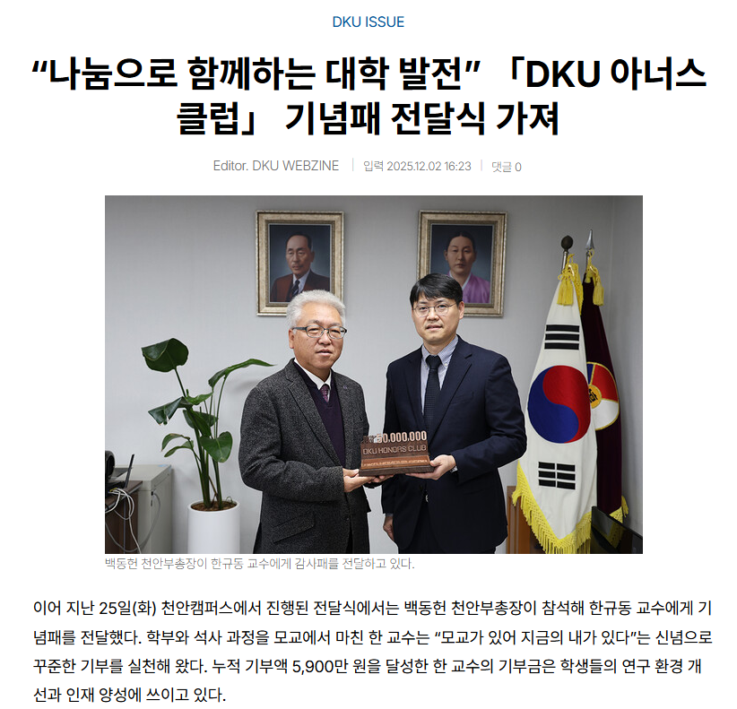 2025.12 스마트동물바이오연구소 공동연구원 강대경 교수 DKU아너스클럽 기념패 수상