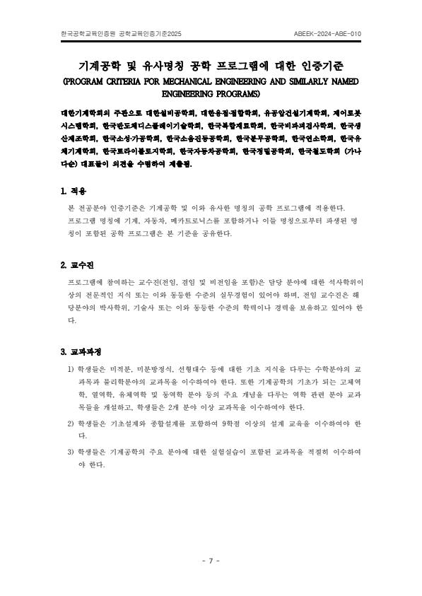 ≫기계공학 및 유사명칭 공학 프로그램에 대한 인증기준
