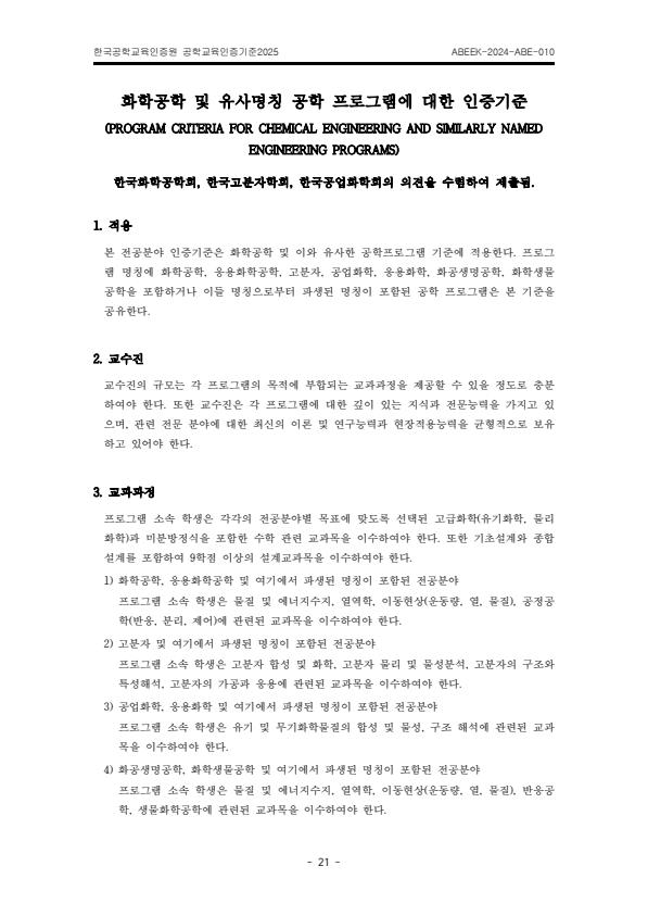 ≫화학공학 및 유사명칭 공학 프로그램에 대한 인증기준