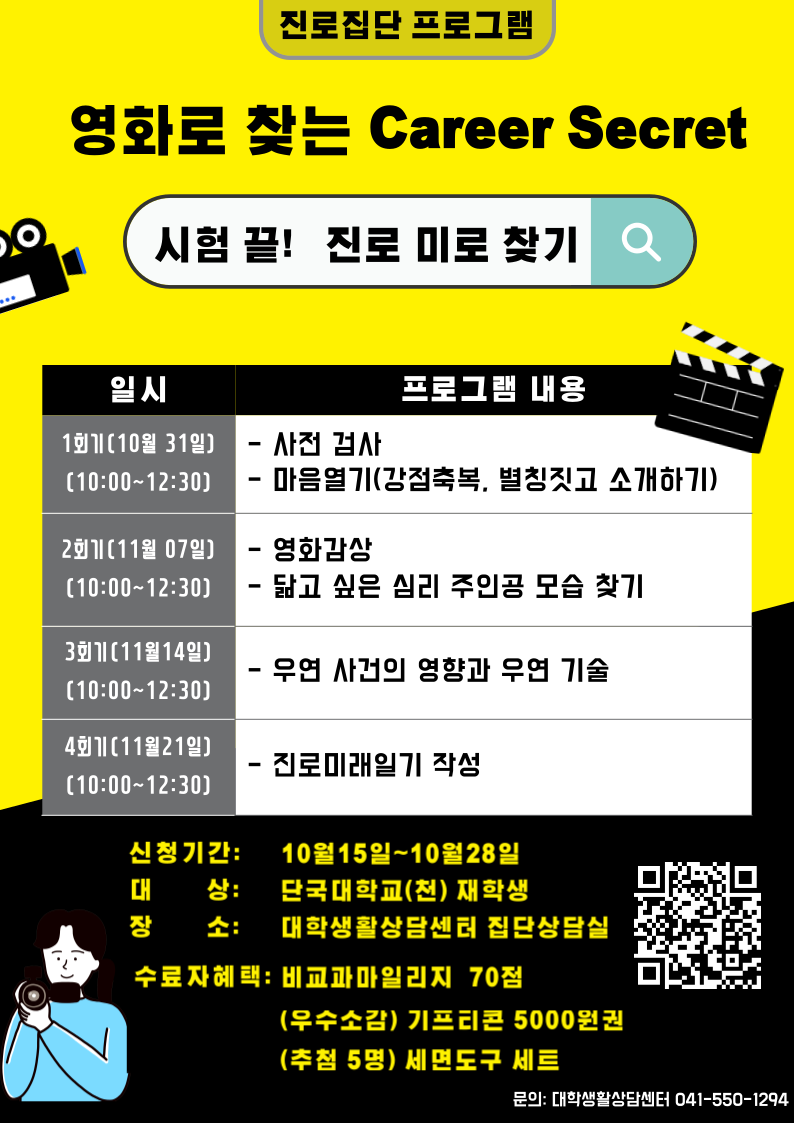 25-2 진로집단상담 '영화로 찾는 Career Secret' 이번 학기도 여러분의 진로고민을 해결해드리고자 진로집단 프로그램을 마련하였습니다. 영화를 보고 다른 사람들과 고민을 함께 나누며 자신의 진로에 대해 생각해 보아요. 수료자분들을 위한 다양한 혜택을 마련하였으니 많은 신청바랍니다! 1. 일시: 2025.10.31(금)~2025.11.21(금) 10:00~12:30 2. 대상: 단국대학교(천) 재학생 3. 장소: 대학생활상담센터 집단상담실 4. 신청: 하단 포스터 QR 또는 링크접속 https://forms.gle/LC8Aj7H4L7dxEPic8 5. 수료자 혜택: 비교과 마일리지 70점/(우수소감 10명) 기프티콘 5000원권/(추첨 5명) 세면도구