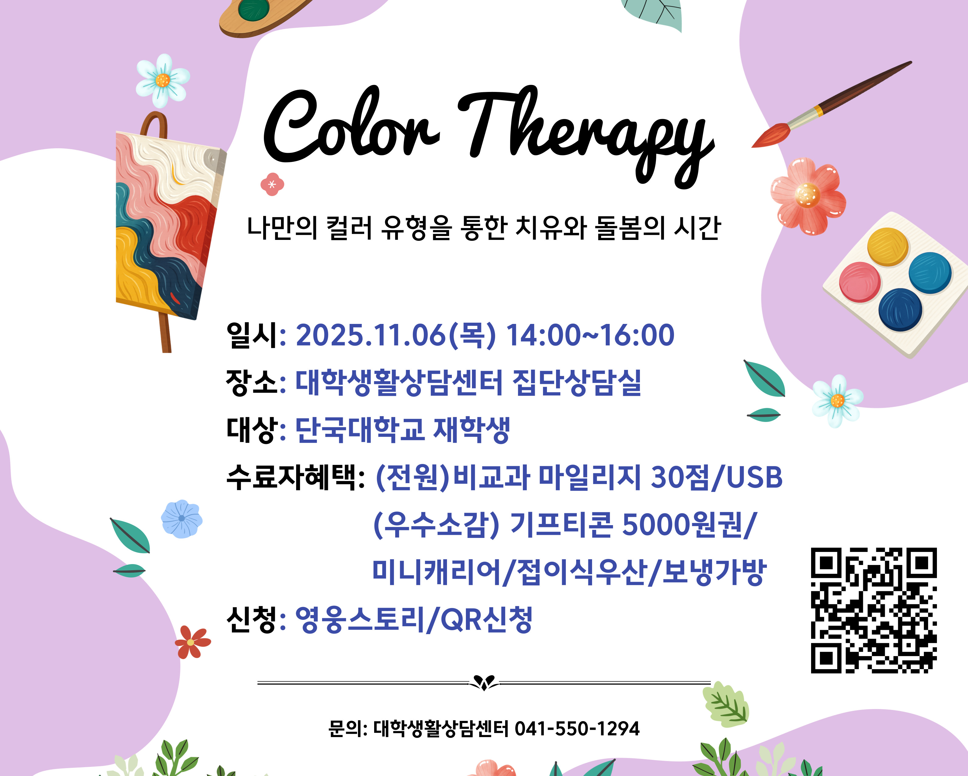 일시: 2025.11.06(목) 14:00~16:00 장소: 대학생활상담센터 집단상담실 대상: 단국대학교 재학생 수료자혜택: (전원) 비교과 마일리지 30점, USB/ 우수소감(10명) 기프티콘 5000원권, 미니캐리어, 접이식우산, 보냉가방 신청: 영웅스토리/하단 포스터 QR신청/https://forms.gle/aUZMDBLRzKXb3f9B7