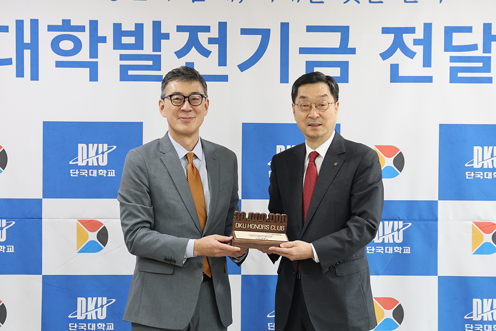 우리 대학이 대학 발전의 원동력인 「DKU 아너스클럽」 기부자에게 기념패를 전달하며 고귀한 나눔에 감사의 뜻을 전했다. 기념패 전달식은 죽전과 천안 양 캠퍼스에서 각각 열렸으며, 김오영 교학부총장(고분자시스템공학부)과 한규동 교수(의생명과학부)가 기념패의 주인공이 됐다. △김재일 대외부총장(왼쪽)이 김오영 교학부총장에게 감사패를 전달하고 있다. 지난 17일(월) 범정관 311호 회의실에서 열린 전달식에는 김재일 대외부총장과 신은종 대외협력처장이 참석해 김오영 교학부총장의 꾸준한 나눔에 감사를 전했다. 김오영 교학부총장은 지난달 23일 1,000만 원을 기부하며 누적 기부액 3,110만 원을 달성했다. 김오영 교학부총장은 “학교 차원에서 이렇게 의미 있는 자리를 마련해 주셔서 감사드린다”며 “대학의 성장은 구성원의 참여가 필요하다는 공동체 의식을 가지고 앞으로도 제자들과 학교 발전을 위해 지속적으로 힘을 보태겠다”라고 소감을 밝혔다. △백동헌 천안부총장이 한규동 교수에게 감사패를 전달하고 있다. 이어 지난 25일(화) 천안캠퍼스에서 진행된 전달식에서는 백동헌 천안부총장이 참석해 한규동 교수에게 기념패를 전달했다. 학부와 석사 과정을 모교에서 마친 한 교수는 “모교가 있어 지금의 내가 있다”는 신념으로 꾸준한 기부를 실천해 왔다. 누적 기부액 5,900만 원을 달성한 한 교수의 기부금은 학생들의 연구 환경 개선과 인재 양성에 쓰이고 있다. 김재일 대외부총장은 “기부를 통해 단국 사랑을 몸소 실천해 주시는 후원자분들께 깊이 감사드린다”며 “교수님들의 성원은 대학 전체의 연구 역량을 단단히 만드는 귀한 밑거름이 될 것”이라고 감사의 뜻을 전했다. 한편, 우리 대학은 고귀한 나눔을 실천하고 꾸준히 후원을 이어오고 있는 기부자를 예우하기 위해 「DKU 아너스클럽」을 운영하고 있다. 현재까지 아너스클럽에 입성한 기부자는 총 1,099명이다. 대외협력처는 지난해 8월부터 누적 기부액 3천만 원 이상 후원자 30명에게 기념패를 전달해 왔다.