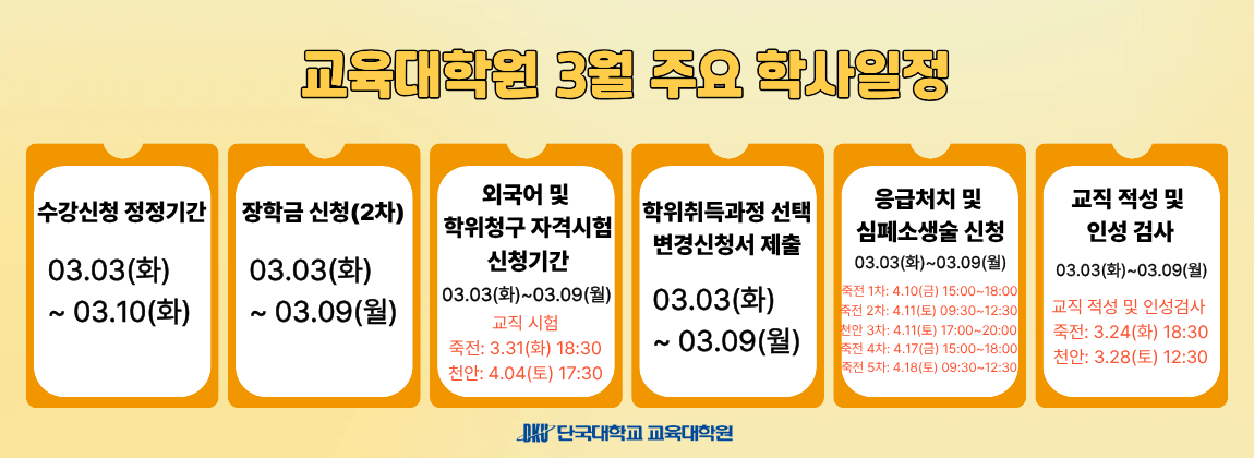 [교원자격증 재발급 신청서 양식 및 신청절차] 1. 재발급 사유: 분실 및 훼손 등으로 인한 교원자격증 사용 불가 시 2. 재발급 대상 - 중등2급정교사: 83년 2월 이후 졸업자 - 특수학교2급정교사: 89년 2월 이후 졸업자 * 참고: 이전 졸업자는 정부24(https://www.gov.kr/portal/main/nologin)에서 재발급 신청 3. 신청절차 교육대학원 홈페이지(https://cms.dankook.ac.kr/web/gedu/) - 게시판 - 자료실 - 교원자격증 재발급 신청서 양식 및 신청절차- 교원자격증 재발급 신청서(첨부파일 참고) 작성 - 전화연락(교육대학원 교학행정팀 ☎031-8005-2241) 3-1. 직접 방문하는 경우 신분증 및 첨부파일(교원자격증 재발급 신청서) 양식을 지참하여 본인 직접 방문 수령(단국대학교 죽전캠퍼스 대학원동 421호) 3-2. 우편 수령하는 경우 첨부파일(교원자격증 재발급 신청서)을 다운받아 작성 후...