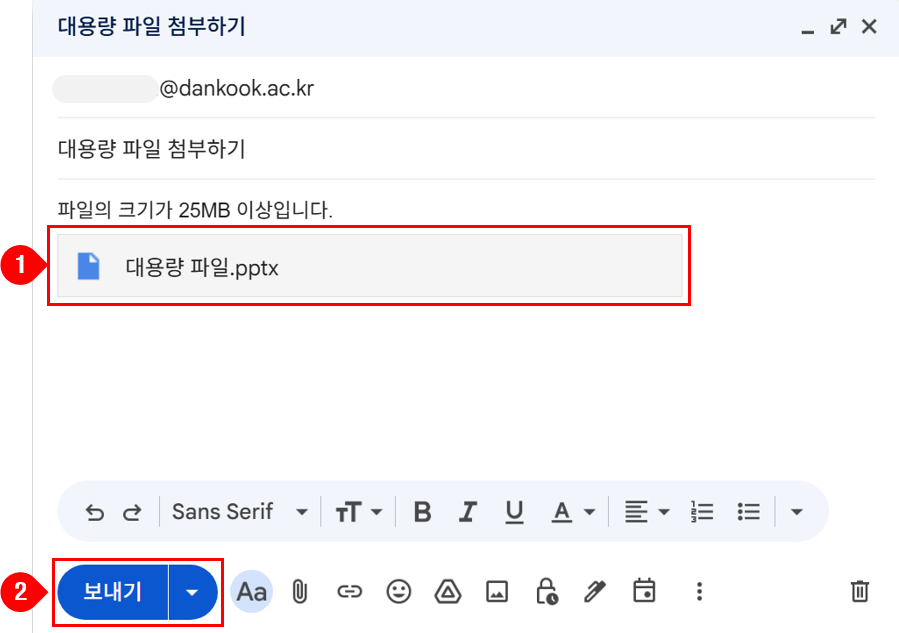 ※ 메일에 파일이 첨부되지 않고, 수신자가 접근 가능한 Google 드라이브 링크가 추가됩니다.