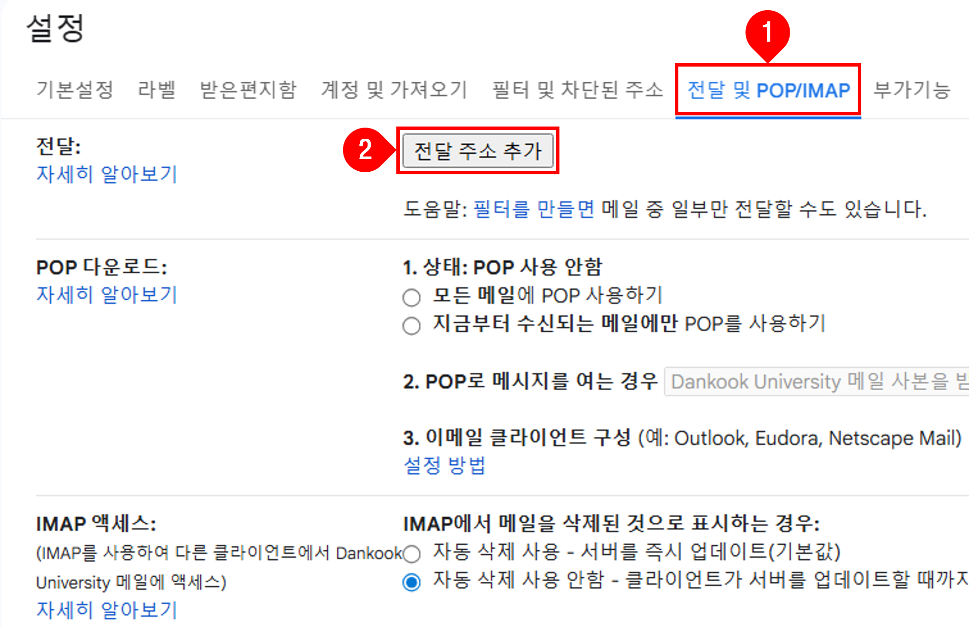 4. '전달' 항목에서 전달 주소 추가를 클릭합니다.