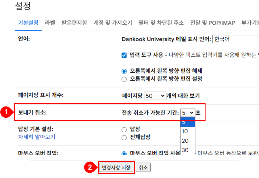 3. '보내기 취소' 항목에서 전송 취소가 가능한 기간(5, 10, 20, 30초)을 선택합니다.
