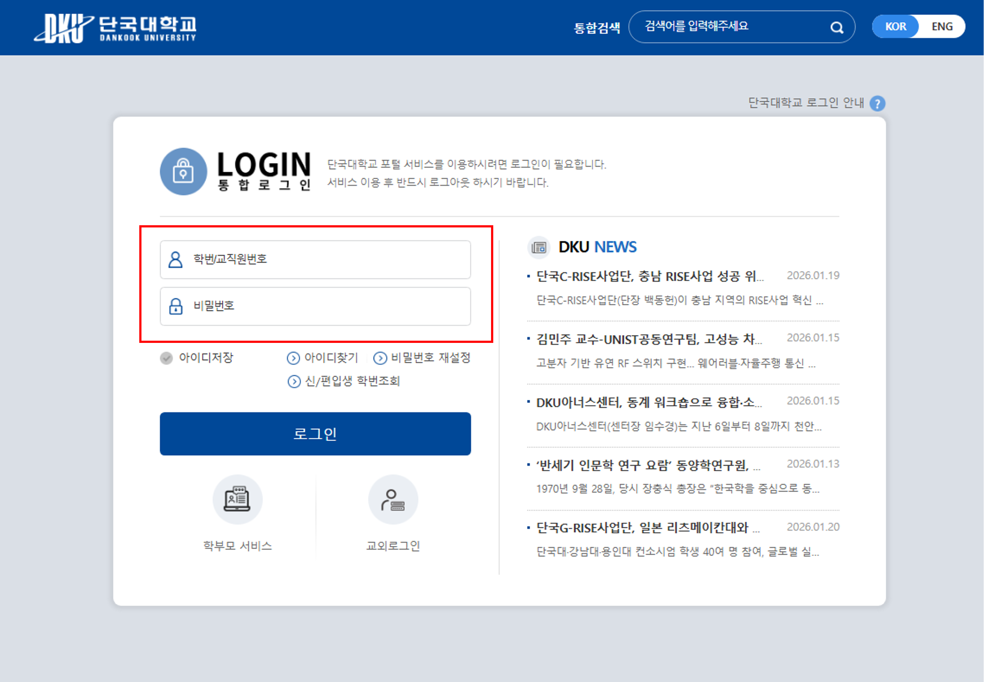 1. 단국대 포털시스템  에 접속 후, 로그인합니다.