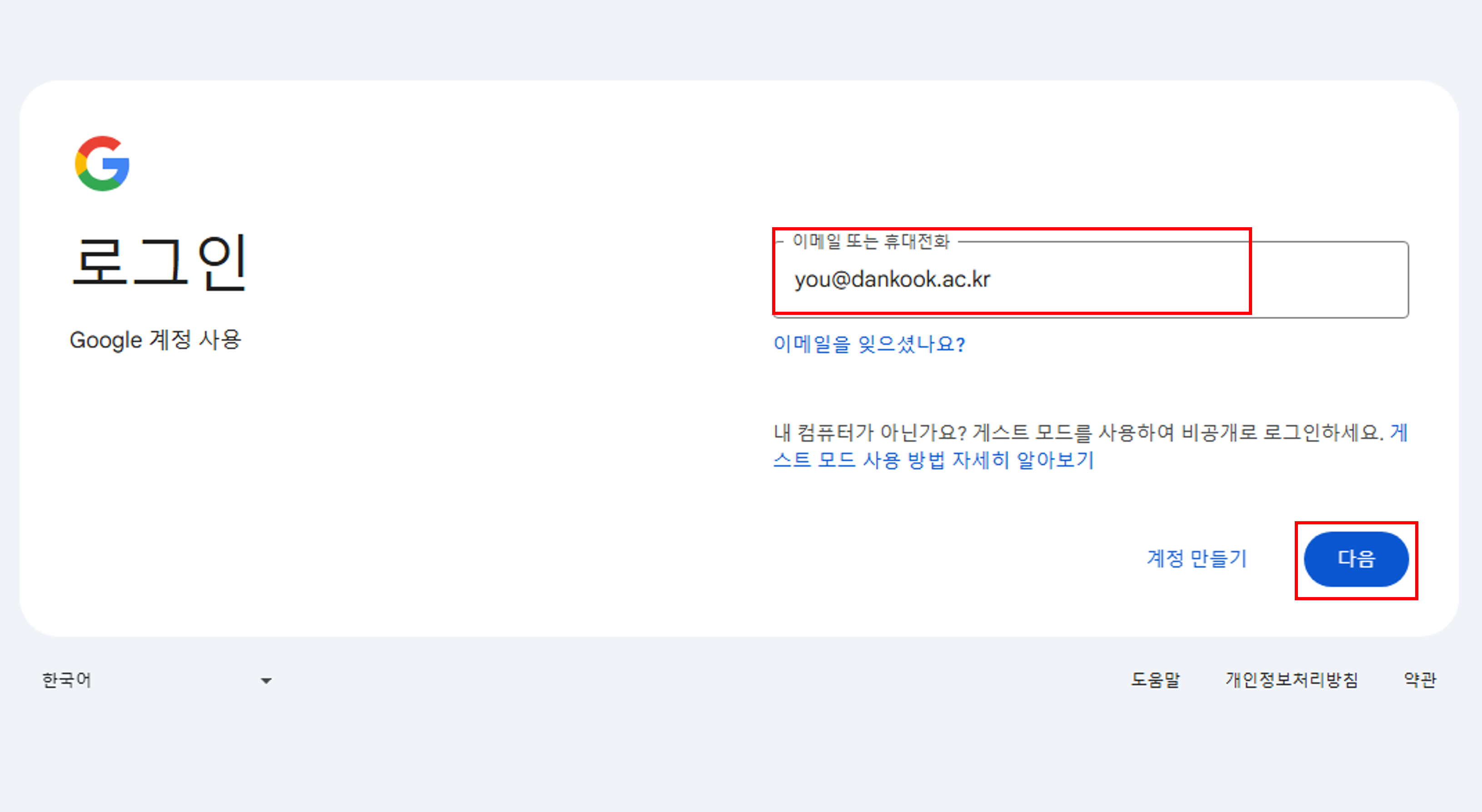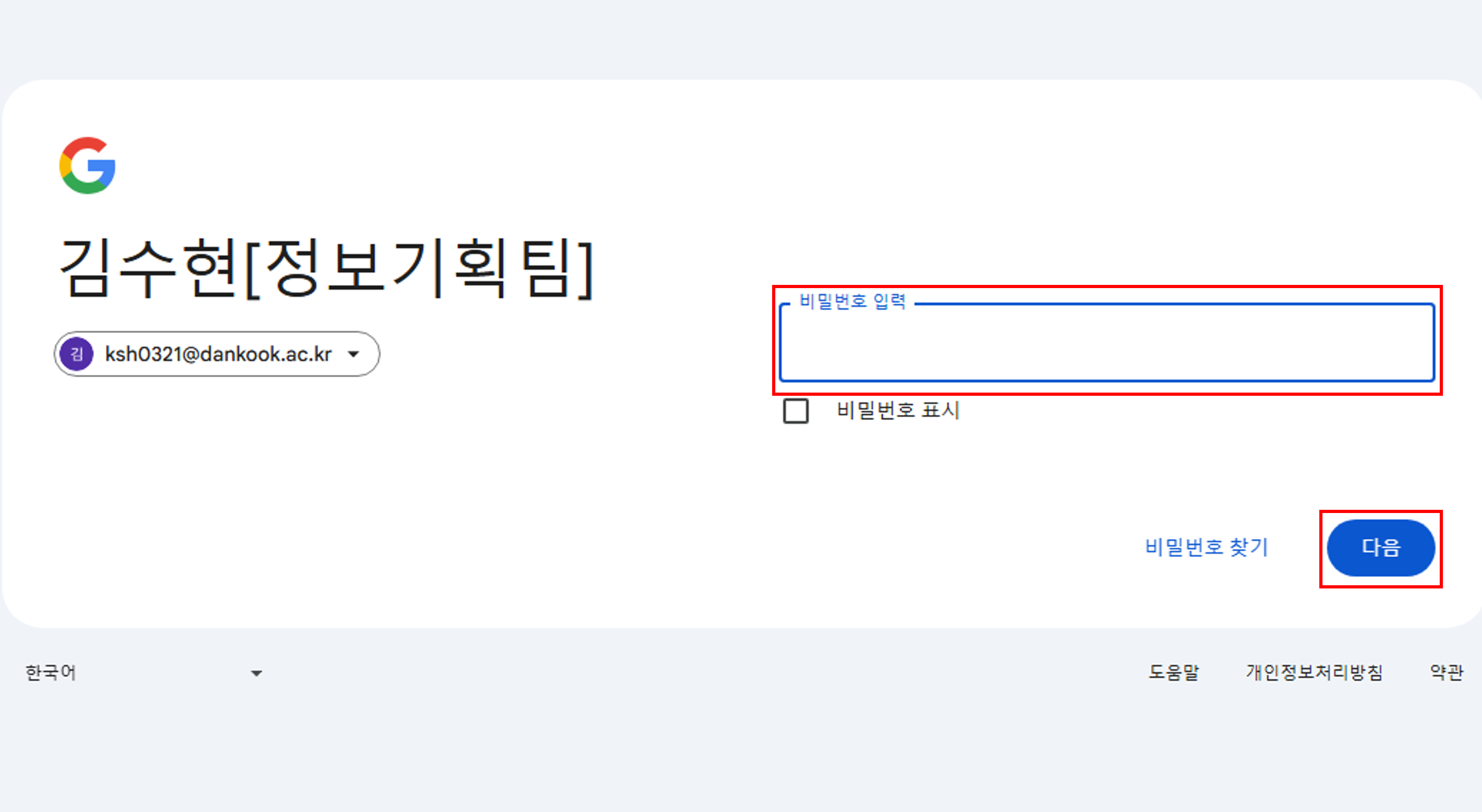 학교 Google 계정의 비밀번호는 단국대학교 포털 계정의 비밀번호와 동일합니다.