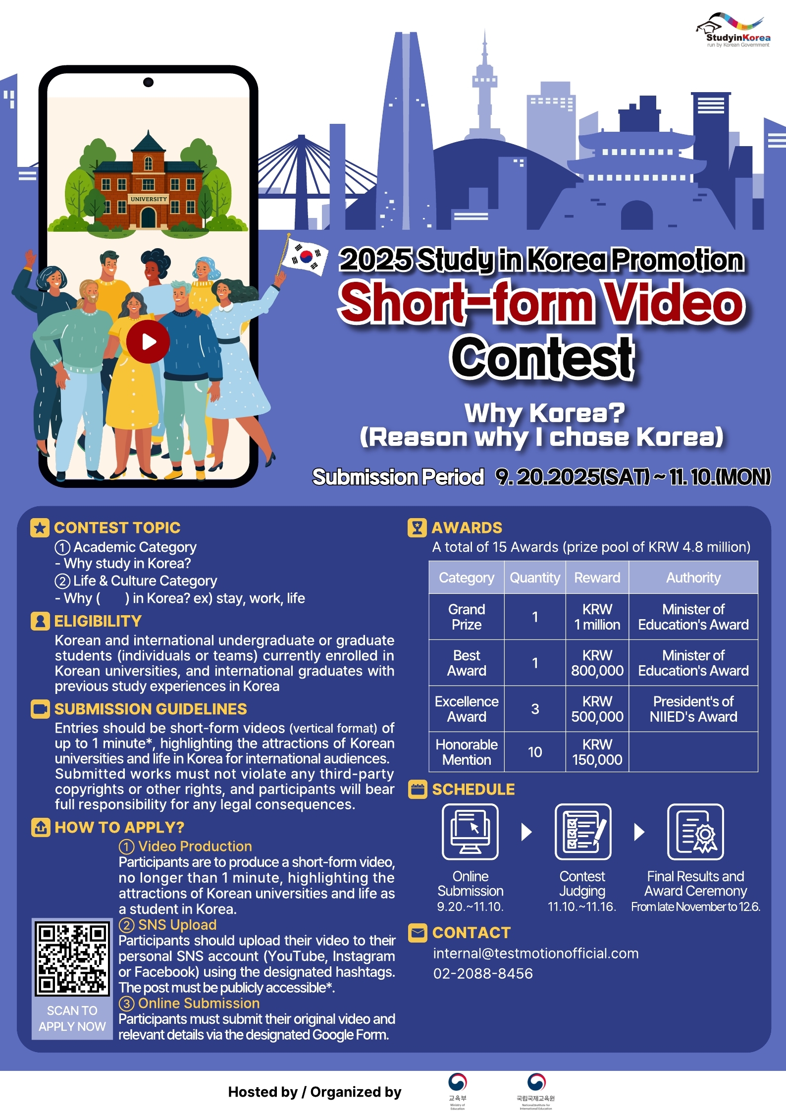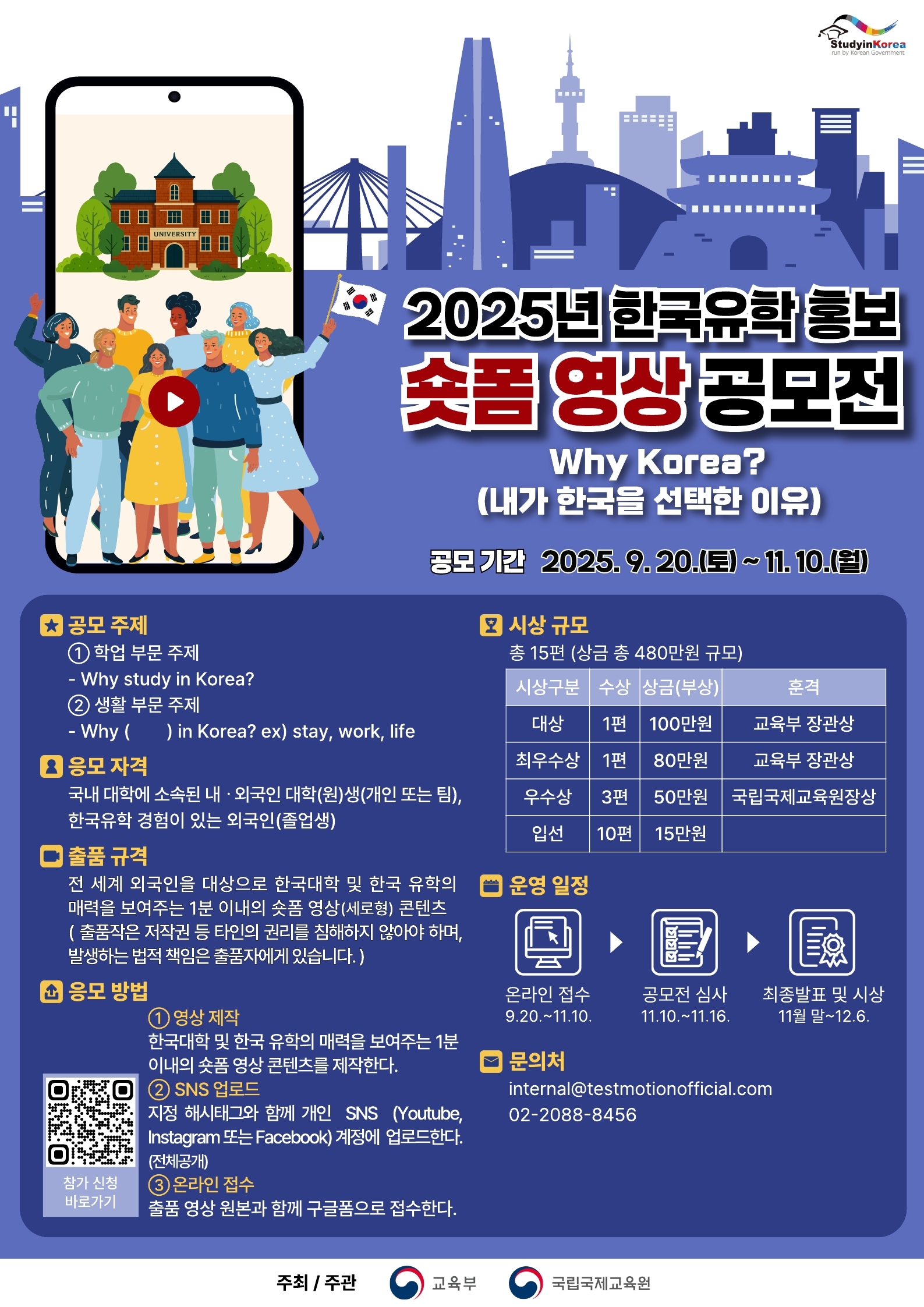 【2025년 한국유학 홍보 숏폼 영상 공모전】 전 세계 외국인을 대상으로 한국대학 및 한국 유학의 매력을 보여주는 1분 이내의 숏폼 영상(세로형) 콘텐츠 제작 ① 주최/주관: 교육부/ 국립국제교육원 ② 공모 기간: 2025. 9. 20(토) ~ 11. 10(월) ③ 공모 주제: ④ 응모 자격: 국내 대학에 소속된 내·외국인 대학(원)생, 한국유학 경험이 있는 외국인(졸업생) ⑤ 응모 방법: 온라인 접수 (포스터 QR) ⑥ 시상 규모: 총 15편(상금 480만원 규모)