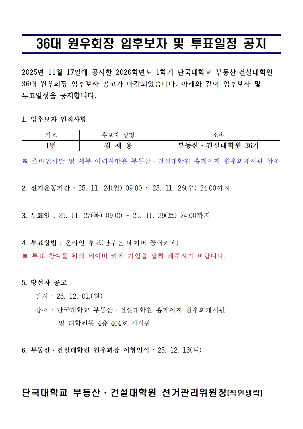 | 36대 원우회장 입후보자 및 투표일정 | |