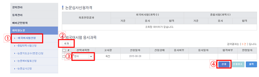 ▶외국어시험 신청방법 안내 ① 웹정보시스템 접속 ② 상단의 [학사정보] 클릭 ③ 좌측의 [대학원논문]> [외국어시험 신청] 클릭 ④ [추가]> 선택과목명 '영어'선택> 신청