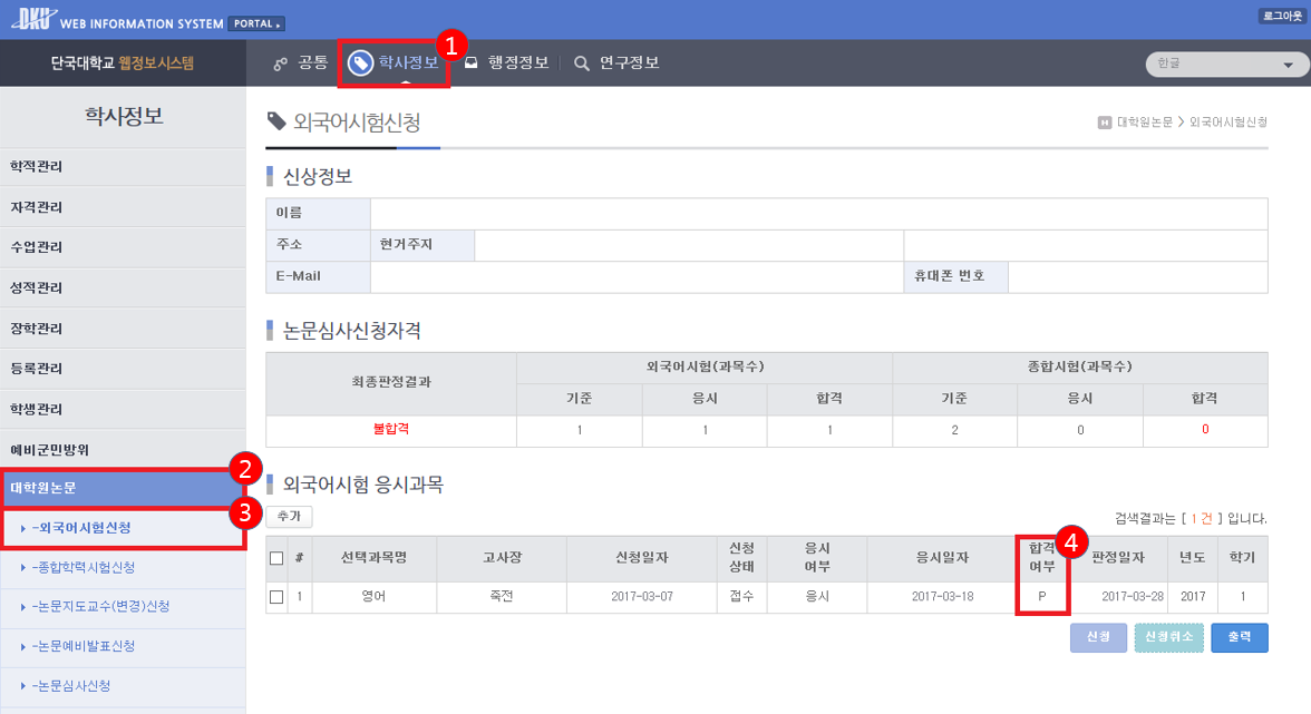 ▶외국어시험 결과 확인방법 안내 ① 웹정보시스템 접속 ② 상단의 [학사정보] 클릭 ③ 좌측의 [대학원논문]> [외국어시험 신청] 클릭 ④ 외국어시험 응시과목란에서 합격여부 확인(P=합격, N=불합격)