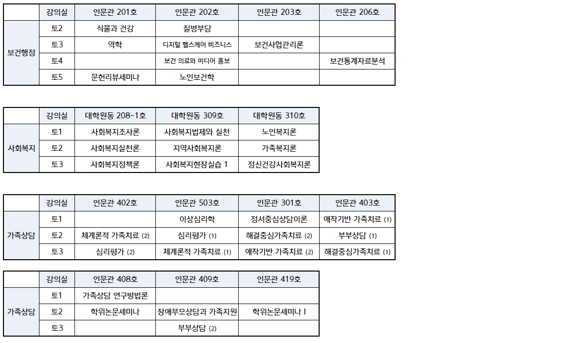 ★가족상담학과/사회복지학과 토1: 09:00~11:30 토2: 12:00~14:30 토3: 14:40~17:10