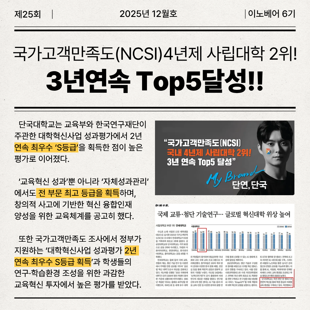 또 하나의 소식는 저희 단국대학교가 국가고객만족도(NCSI) 사립대 가운데 2위를 달성하면서, 3년 연속 Top5자리를 유지하고 있습니다🏅
