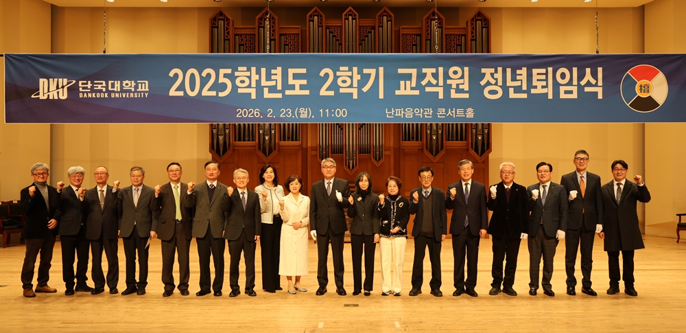 우리 대학의 발전을 위해 헌신해 온 교직원 25명(교원 18명·직원 7명)이 정든 교정을 떠난다. 23일(월) 죽전캠퍼스 난파음악관 콘서트홀에서 2025학년도 2학기 교직원 정년퇴임식이 열렸다. ​​​ △정년퇴임 교직원과 교내 관계자들이 기념촬영을 하고 있다.  이날 행사에는 안순철 총장을 비롯해 백동헌 천안부총장, 김재일 대외부총장, 오좌섭 산학부총장, 이영희 교수회장, 조영식 직원노동조합위원장 등 주요 보직자와 퇴임자 가족, 동료, 제자들이 참석해 그간의 노고에 감사를 전하고 새로운 출발을 축하했다.  안순철 총장은 교육·연구·행정 등 각자의 자리에서 대학 성장에 기여한 공로를 기리며 퇴임 교직원들에게 공로패와 정부포상을 수여했다. ​​​ △안순철 총장이 정년퇴임 교직원들에게 공로패와 정부포상을 수여하고 있다. 안 총장은 식사에서 “교육·연구·행정 각자의 자리에서 맡은 바를 든든히 지켜온 책임감과 열정은 대학 성장의 밑거름이 됐다”며 “여러분의 역사가 곧 대학의 역사이며, 이는 대학 창학 100년을 여는 기반이 될 것”이라고 말했다. 이어 “퇴임 이후의 시간이 삶의 새로운 여정을 완성하는 소중한 시간이 되길 바란다”고 덧붙였다. ​​​ △안순철 총장이 정년퇴임 교직원들에게 감사의 인사를 전하고 있다. 34년간 학문과 교육에 헌신한 이재훈 교수(건축학부)는 “학교의 든든한 지원 속에서 학생들을 가르칠 수 있었던 시간은 제 인생의 큰 행운이었다”며 “퇴임을 끝이 아닌 새로운 출발로 삼아 삶의 또 다른 여정을 시작하고자 한다”고 소회를 밝혔다. 대학 행정 발전에 헌신해온 김희영 선생(자유교양대학 교학행정1팀)은 “39년간 대학의 성장을 곁에서 지켜보며 소임을 다할 수 있어 영광이었다”며 “앞으로도 대학의 발전을 늘 응원하겠다”고 말했다.  ▷정년퇴임 교직원 명단 / 정부포상 교직원 명단 ​​​   ​​​​