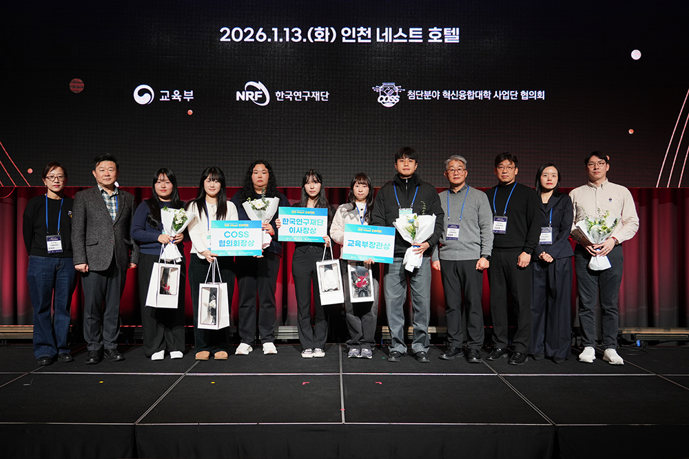 바이오헬스 혁신융합대학(단장 김장묵)이 지난 1월 13일 인천 네스트호텔에서 열린 ‘2025 COSS 성과포럼’에 참석해 첨단분야 혁신융합대학사업의 운영 성과와 향후 발전 방향을 공유했다. 이번 성과포럼은 첨단분야 혁신융합대학사업의 대표 성과를 한자리에 모아 점검하고, 대학 간 공동 교육혁신 모델의 확산 가능성을 논의하기 위해 마련됐다.. △ 우리 대학 학생팀이 우수한 성과를 거두며 두각을 나타냈다. 성과 포럼과 함께 진행된 ‘WE-Meet 프로젝트’ 본선에서는 재학생팀이 우수한 성과를 거두며 두각을 나타냈다. 수상팀은 ▲교육부장관상 ‘나우레스큐팀’[김도환(건축공학전공 4학년), 김나연, 유지우, 장유진(이상 보건행정학과 3학년) 최혜원(상명대학교)] ▲한국연구재단이사장상 ‘예술과 인지과학팀’[정윤지(미생물학전공 4학년), 정윤정(보건행정학과 4학년), 김규리(홍익대학교)] ▲COSS협의회 회장상 ‘만파식적팀’ [류선경(뉴뮤직과 4학년), 김연주(한서대학교)] 이다. 각 수상팀은 바이오헬스 산업 현장의 실제 문제를 기반으로 프로젝트를 수행하며 전공 간 협업을 통한 융합적 사고 역량과 문제 해결을 위한 실천 역량을 입증했다는 평가를 받았다. △ 김장묵 단장(왼쪽 일곱 번째)이 혁신융합대학사업 성과 창출에 기여한 공로를 인정받아 교육부장관상을 수상했다. 김장묵 단장도 2025학년도 첨단분야 혁신융합대학사업(COSS)의 성과 창출에 기여한 공로를 인정받아 교육부장관상을 수상했다. 김 단장은 4년 연속 최우수 컨소시엄 선정이라는 성과를 이끌며 COSS 공동교육과정을 개발·운영·표준화하고 교육 현장에 안정적으로 정착시키는 데 핵심적인 역할을 수행했다. 특히 컨소시엄 참여 대학 간 협업을 기반으로 대학별 특화 역량을 유기적으로 결합한 공동 교육 모델을 구축해 실질적인 융합 교육 성과를 창출했다는 점에서 높은 평가를 받았다. 포럼과 연계해 열린 콜로키움에서는 우리 대학의 교육 혁신 사례가 공유되어 참석자들의 큰 관심을 받았다. 정효정 교수학습혁신센터장은 「산업계 수요를 반영한 마이크로디그리 혁신사례」를 주제로 발표를 진행했다. 이번 발표에서는 AI 시대 융합인재 양성을 위한 공동 교육혁신 사례와 함께 COSS 컨소시엄 연계형 마이크로디그리 운영 모델이 소개됐다. 김장묵 단장은 “바이오헬스 혁신융합대학은 사업 초기 레드바이오와 디지털 헬스케어 중심 교육과정에서 출발했으나, 현재 그린바이오와 화이트바이오 분야까지 연계·확장하고 있다”며 “앞으로도 지·산·학·연·관·민 협력을 기반으로 변화하는 산업 생태계에 선제적으로 대응하고 융합형 인재 양성을 위한 교육체계 고도화를 지속해 나가겠다”고 밝혔다. [대학뉴스 제보] 죽전 홍보팀 : 031-8005-2032~3, 천안 홍보팀 : 041-550-1061