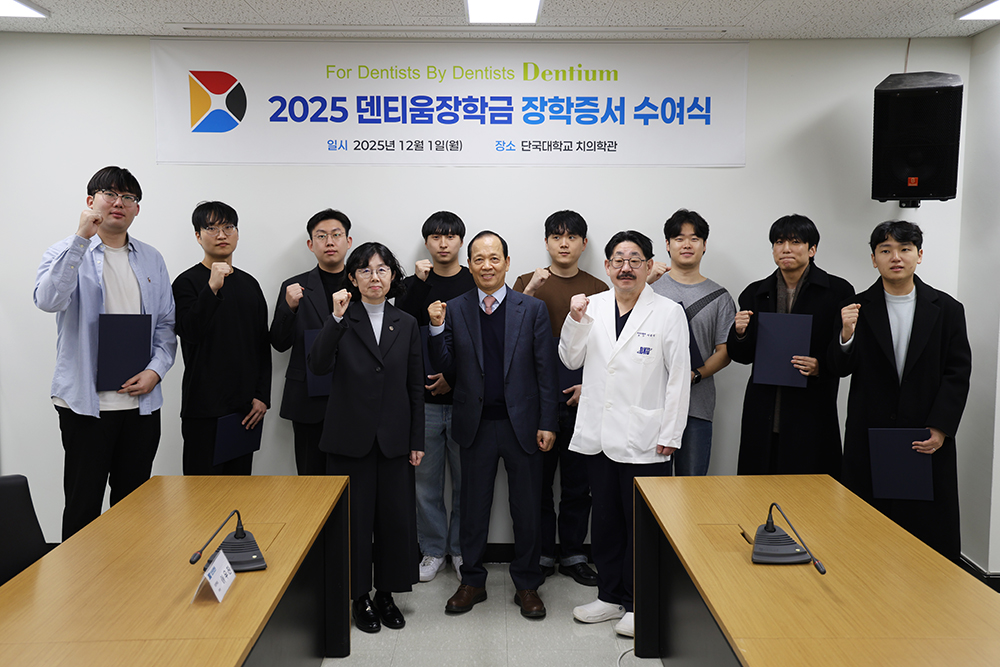 치과대학이 1일(월) 치의학관 회의실에서 ‘2025 덴티움장학금 장학증서 수여식’을 개최했다. 이번 행사는 ㈜덴티움의 지속적인 후원에 감사하고, 미래 치의학계를 이끌 인재들을 격려하기 위해 마련됐다. △(주)덴티움 이창영 사장(가운데)이 장학생들과 함께 기념사진을 촬영했다. ㈜덴티움은 지난 2013년부터 12년간 치과대학에 총 1억 3,630만 원의 장학금을 후원하며 총 55명의 학생들에게 장학금을 전달했다. 또한 연구지원금 1억 4천만 원과 임상실습용 덴탈체어 5대도 기증했다. 누적 기부금은 3억 3,475만 원에 달한다. 수여식에는 ㈜덴티움 이창영 사장, 조성현 팀장과 고선일 치과대학 학장과 교수진 등이 참여했다. 이창영 사장은 축사를 통해 “최근 임플란트 시장과 대외 무역 환경이 녹록지 않지만, 덴티움은 장학금을 줄이지 않으려 노력하고 있다”며, “이 장학금이 여러분이 훌륭한 치과의사가 되는 데 작은 보탬이 되길 바란다”고 전했다. 이어 “받은 나눔을 주변에 다시 실천하는 치과의사로 성장하길 기대하며, 덴티움은 그 시작에 함께할 수 있어 매우 뜻깊다”고 덧붙였다. 장학증서를 받은 김종한 학생(치의학과 4학년)은 “장학금을 통해 더욱 책임감을 갖고 공부에 임하겠다”며 “앞으로는 저 역시 받은 나눔을 사회에 실천하는 치과의사가 되고 싶다”고 말했다. ㈜덴티움은 2000년 창립 이후 “For Dentists, By Dentists”라는 철학 아래 임플란트 전문 기업으로 성장해왔다. 설립 초창기부터 ‘품질 절대주의’라는 확고한 신념을 바탕으로 전 세계 70여 개국에 수출하는 글로벌 의료기기 브랜드로 자리매김했다. [대학뉴스 제보] 죽전 홍보팀 : 031-8005-2032~5, 천안 홍보팀 : 041-550-1061