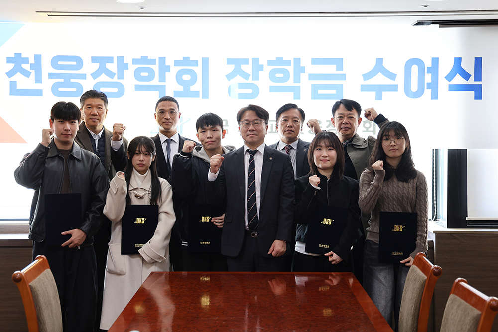 △장학금 전달식 모습 우리 대학에 재직 중인 천안캠퍼스 졸업 동문들이 설립한 천웅장학회(회장 이명수)가 장학금 수여식을 갖고 재학생 6명에게 총 6백만 원의 장학금을 전달했다. 천웅장학회는 우리 대학에 재직 중인(교원, 직원, 병원직원 등) 천안캠퍼스 졸업 동문들이 설립한 장학회로 지난 1989년 후배들의 장학금 조성을 위해 설립됐다. 천안의 첫 글자인 ‘천’과 대학의 상징인 검은곰(熊) ‘웅’을 조합해 ‘천웅장학회’로 지었다. 장학금 조성에는 현재까지 70여 명의 재직 및 퇴직 교직원이 참여했으며 지난해에는 후배들을 위해 장학금으로 사용해 달라며 자체적으로 관리하던 적립금 2억 2천여만 원을 전액 대학에 기탁했다. 현재까지 약 130여 명의 학생들에게 9,500여만 원의 장학금을 지급했다. 전달식에는 천웅장학회 이명수 회장(입학팀장, 서양학과 96년 졸), 추일엽 팀장(장학팀, 행정학전공 04년 졸), 박형준 팀장(취창업진로2팀, 화학과 96년 졸), 임지수 팀장(예술대학 교학행정팀, 국제농업개발학과 98년 졸) 진광민 팀장(학생팀, 응용수학전공 04년 졸)과 천웅장학생 6명이 참석했다. 이명수 회장은 “천웅장학회는 단국을 사랑하는 선배들이 마음을 모은 순수한 후배 사랑의 결과”라며 “앞으로도 더 많은 학생들이 학업에 집중할 수 있도록 꾸준히 지원을 이어가겠다”고 말했다. 장학금을 받은 안순우 학생(글로벌한국어과 1학년)은 “뜻깊은 장학금을 받을 수 있어 정말 감사하다”며 “이 소중한 기회를 바탕으로 학업에 더욱 정진하겠다”고 소감을 전했다. [대학뉴스 제보] 죽전 홍보팀 : 031-8005-2032~5, 천안 홍보팀 : 041-550-1061