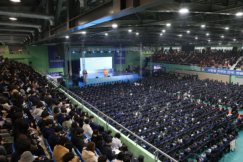 새내기 단국인 5,015명(죽전 2,567명·천안 2,448명)이 단국의 새 가족이 되었다. 학생처는 24일(화) 양 캠퍼스 체육관에서 수험생활을 마친 신입생들의 첫걸음을 내딛는 입학식을 개최했다. ​​​​​​​​​​​​​​​ △ 입학식이 진행된 양 캠퍼스 체육관 전경 2026학년도 입학식에는 안순철 총장과 김오영 교학부총장, 백동헌 천안부총장, 김재일 대외부총장 등 교무위원과 총동창회 장세현 수석부회장 등이 참석해 신입생의 입학을 축하했다. ​​​​​​​​​​​​​​​ △신입생 대표[죽전캠퍼스 : 김승빈(퇴계혁신칼리지)·서우정(전자전기공학전공), 천안캠퍼스 : 김민석(율곡혁신칼리지)·김다현(의예과)]가 선서를 하고있다 입학식은 단국의 역사와 미래를 담아 제작한 특별영상을 시작으로 △신입생 입학허가 선언 △신입생 대표 선서 △장학생 장학증서 수여 △총장 식사 △총동창회장 축사 △동문 환영인사 순으로 진행됐다. ​​​​​​​​​​​​​​​ △ 안순철 총장이 신입생들에게 축하와 격려의 메시지를 전했다. 안순철 총장은 “우리 대학은 변화와 혁신의 DNA를 바탕으로 시대가 요구하는 인재를 길러온 대학”이라며 “인공지능과 디지털 전환의 시대 속에서 여러분이 스스로 사고하고 연결하며 새로운 가치를 만들어가는 주인공이 되길 바란다”고 말했다. 특히 “큰 목표는 하루아침에 이루어지지 않기에 ‘마부작침’의 자세로 하루하루를 성실히 쌓아간 시간이 여러분을 더욱 단단하게 성장시킬 것”이라고 격려했다. ​​​ △ 특별영상을 통해 대학의 역사를 소개했다. ​​​​​​​​​​​​​​​ △ 고정용 총동창회장을 대신하여 장세현 총동창회 수석부회장이 축사를 전하고 있다. 장세현 총동창회 수석부회장은 “26만 동문을 대표해 새로운 출발선에 선 여러분을 진심으로 환영한다”며 “단국의 이름으로 사회 각 분야에서 활약하고 있는 동문들이 여러분의 도전을 든든히 응원하겠다”고 밝혔다. 이어 “오늘의 각오와 다짐을 끝까지 이어가 자랑스러운 단국인으로 성장하길 바란다”고 강조했다. 우수한 성적으로 대학에 입학한 신입생 총 473명에게 △범정 △혜당 △단국인재 △글로벌인재 △성적우수 장학생으로 선발돼 장학금과 장학증서가 수여됐다. ​​​​​​​​​​​​​​​ △ 안순철 총장이 대표 수상자에게 장학증서를 전달하고 있다. 범정장학생으로 선발된 김승빈(퇴계혁신칼리지)·홍승범(사학과)·김민석(율곡혁신칼리지)·박준서(영어과)와 혜당장학생으로 선발된 김시우(소프트웨어학과)·서우정(전자전기공학과)·김다현(의예과)·유호연(의예과)이 입학생을 대표해 장학증서를 각각 받았다. 범정 장학생으로 선정된 김승빈(퇴계혁신칼리지) 군은 “큰 상을 받아 아직도 실감이 나지 않지만 정말 기쁘고 초심을 잃지 않고 즐거운 마음으로 대학생활에 최선을 다하겠다”고 밝혔다.  혜당 장학생으로 선정된 김다현(의예과) 양은 “새로운 출발을 단국대에서 하게 되어 설레고 감사한 마음이 크다”며 “기대에 부응할 수 있도록 성실하게 배우고 성장하겠다”고 전했다. ​​​​​​​​​​​​​​​ △ 신입생들을 위한 선배들의 다양한 공연이 진행됐다. ​​​​​​​​​​​​​​​ △ 궂은 날씨에도 진행된 신입생을 위한 다채로운 프로그램 ​​​​​​​​​​​​​​​