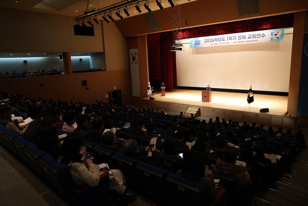 2026학년도 1학기 전체 교원연수가 25일(수) 죽전캠퍼스 학생회관에서 개최됐다. 이번 연수에는 안순철 총장을 비롯해 700여 명의 교원이 참석해 새 학기 학사 운영 방향과 주요 정책을 공유했다.  ​​​​​​​​​​​​​​​ △2026학년도 1학기 전체 교원연수 전경  안순철 총장은 인사말에서 “학령인구 감소와 고등교육 재정 제약, AI와 디지털 전환 등 다양한 변화 속에서도 지난해 대학 평가와 재정지원사업, 산학협력, 교육환경 개선 등 모든 면에서 의미 있는 성과를 거둘 수 있었다”며 “올해는 개교 80주년을 앞두고 창학 100년을 향한 새로운 비전과 전략을 본격적으로 준비해야 하는 중요한 시점”이라고 밝혔다.  ​​​​​​​​​​​​​​​ △안순철 총장이 2026학년도 1학기 전체 교원연수에서 인사말을 하고 있다.  이어 “치열해지는 대학 간 경쟁 속에서 연구 성과는 대학의 위상을 결정하고 교육의 깊이와 미래 경쟁력을 좌우하는 핵심 요소”라며 “교육과 연구 현장에서 구성원 모두가 한마음으로 노력할 때 대학의 비전이 현실이 될 것”이라고 강조하고 교원들의 지속적인 협력을 당부했다.  ​​​​​​​​​​​​​​​ △전체 교원연수에서 2026학년도 1학기 신규 임용 교원들이 소개됐다. 이날 연수에서는 교육 성과를 격려하기 위한 베스트티칭어워드 시상이 진행됐으며, 2026년 1학기 신규 임용 교원 소개가 이어졌다. ​​​​​​​​​​​​​​​ △김재일 대외부총장(대학평가전략위원장)이 대외 평가 연구지표 결과를 발표하고 있다.  ​​​​​​​​​​​​​​​ △남재걸 기획실장이 학과평가 추진 방향에 대해 발표하고 있다.  또한 대학 주요 정책과 운영 방향을 공유하는 발표가 진행돼 ▲2025학년도 주요 대외평가 연구지표 결과(대학평가전략위원회) ▲학과평가 추진 방향(기획실) ▲2026학년도 교무 운영 계획(교무처) 등이 제시됐다. ​​​​​​​​​​​​​​​