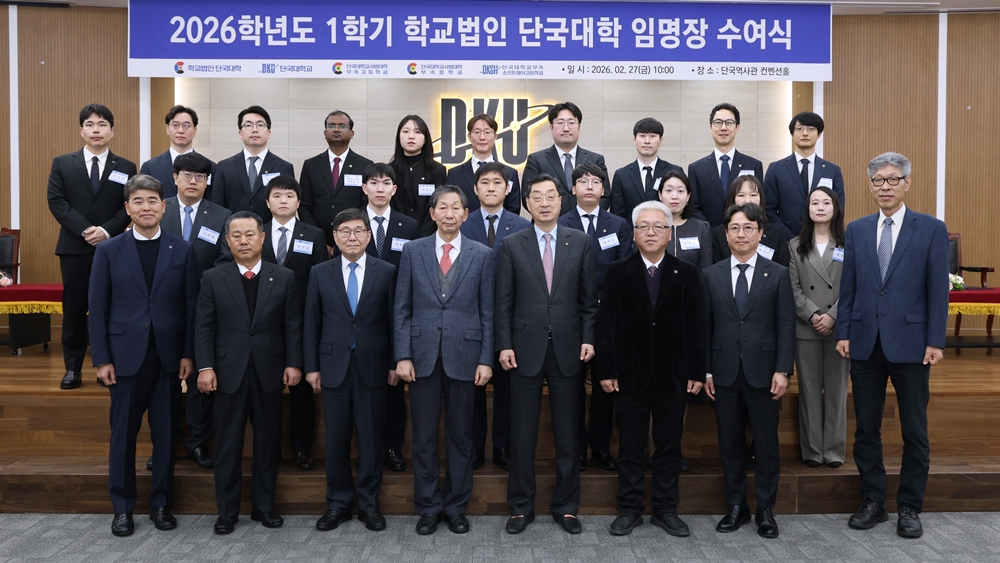 장호성 이사장이 27일(금) 단국역사관 컨벤션홀에서 신규 임용 교직원 및 보직 선임자 58명에게 임명장을 수여하며 대학 발전을 위한 새로운 도약을 다짐했다. 임명장을 받은 교직원은 ▲신규 임용 교원 18명 ▲신규 임용 직원 15명 ▲보직 선임 및 직급 승진자 25명 등 총 58명이다.   ​​​ ▲신임 교직원·보직자 임명장 수여식이 단국역사관 컨벤션홀에서 열렸다.   장호성 이사장은 “대학 발전을 위해 한마음 한뜻으로 교육과 연구, 행정에 매진해 달라”며 “AI와 디지털 전환이 교육의 패러다임을 바꾸고 있는 지금, 변화를 두려워하지 말고 AI 활용 등 새로운 기술을 교육·연구·행정에 능동적으로 접목해 대학 혁신을 이끄는 주역이 되어 달라”고 당부했다.   안순철 총장은 “새롭게 단국 가족의 일원이 된 신규 임용 교직원 여러분께 진심으로 감사와 환영의 뜻을 전한다”라며 “치열해지는 대학 생존 경쟁 속에서 지속 가능한 대학으로 나아가기 위해 최상의 교육·연구와 행정에 모두가 한마음으로 노력해 주기 바란다”라고 강조했다.  ​​​ ▲신규 임용 전임교원 기념사진 ​​​ ▲신규 임용 직원 기념사진  ​​​ ​​​ ▲보직 및 직급 승진 기념사진   ​​​​​​​
